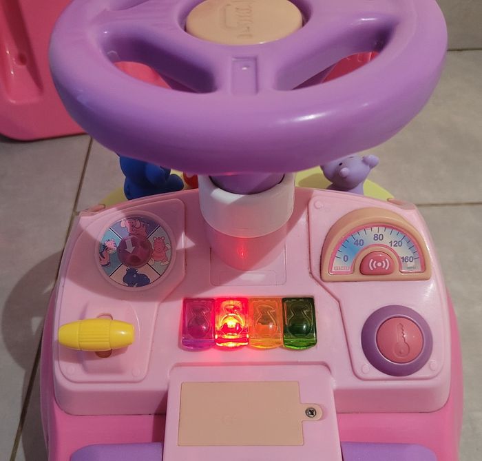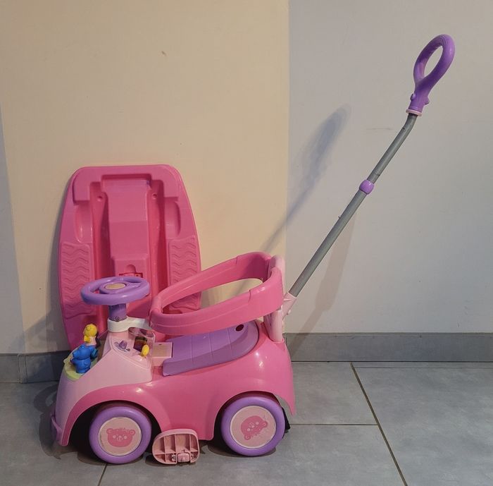 Porteur évolutif, dans les tons rose et violet, de la marque Toys"R"us, en très bon état. Les éléments lumineux et sonores fonctionnent parfaitement. Bascule possible avec plate-forme amovible