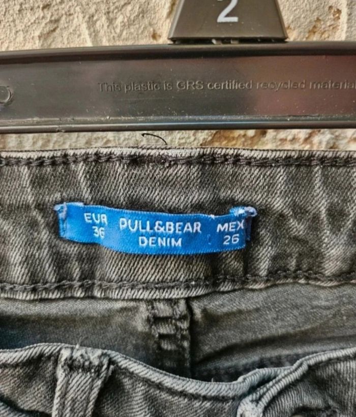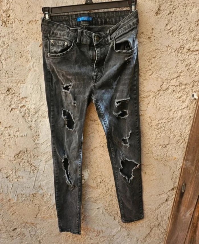 Jean skinny troué aux jambes noir assez moulant Taille haute Pull & bear Taille 36 bon état Petite tache sous la poche de derrière (voir photo) Prix négociable Remise en main propre possible