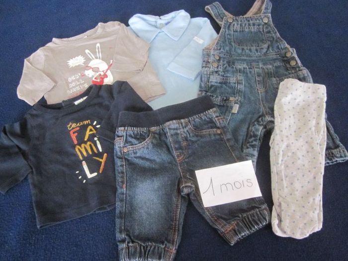 1m, salopette jean + jean + 2 hauts ml + body ml col + legging pied, de bon matin, kitchoun, kiabi