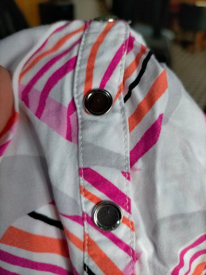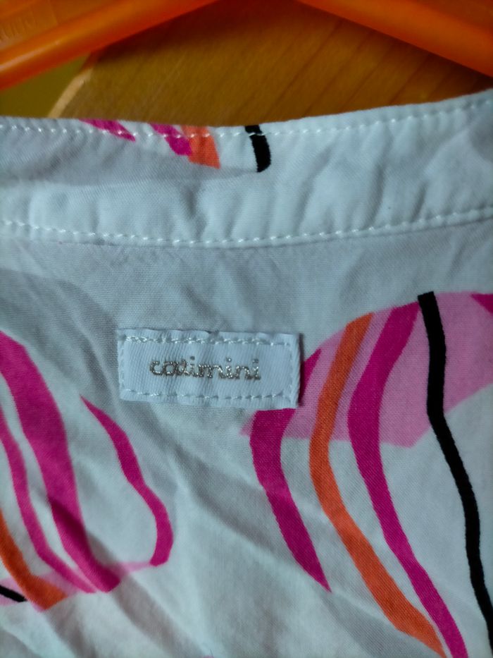 BE Il manque le dessus des pressions mais ne se remarque pas porté. Très jolie robe à petites manches en cotonnade fluide blanche imprimé de berlingots rose et corail. Taille élastique, galon aux épaules et étiquette catimini au dos