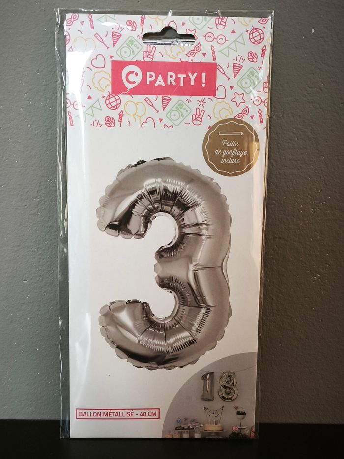 NEUF Ballon métallisé chiffre 3. Une paille de gonflage est incluse à l'intérieur. ​Gonflage à l'air uniquement (la taille de 40 cm est généralement trop petite pour flotter avec de l'hélium).
