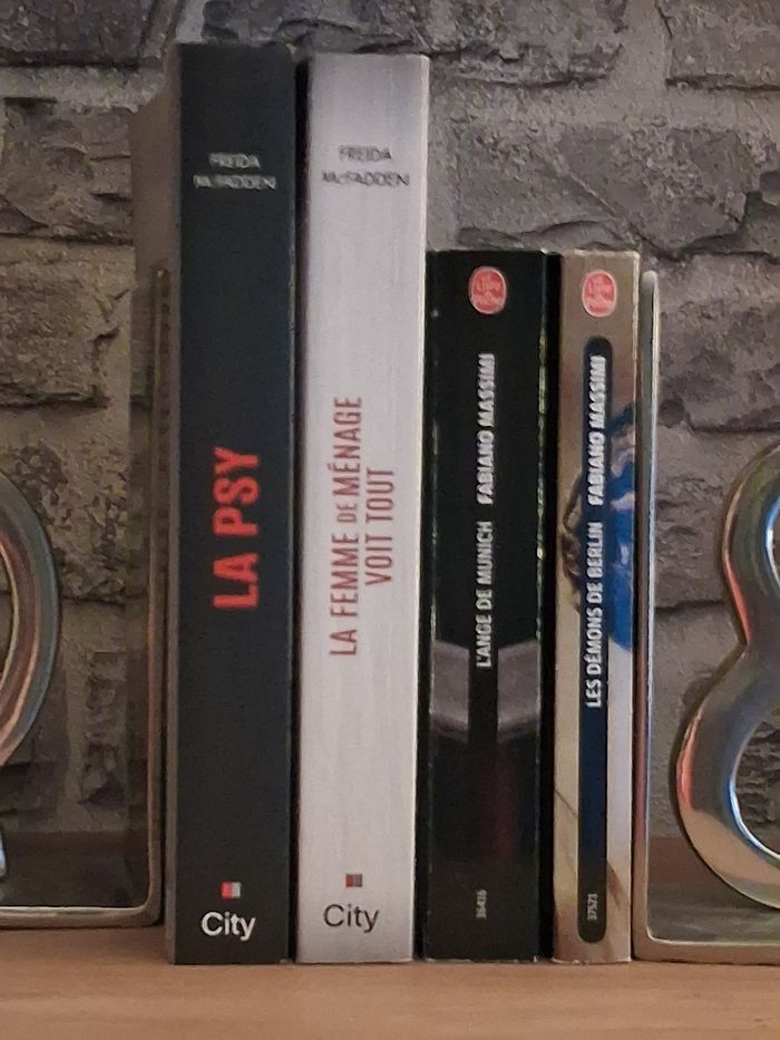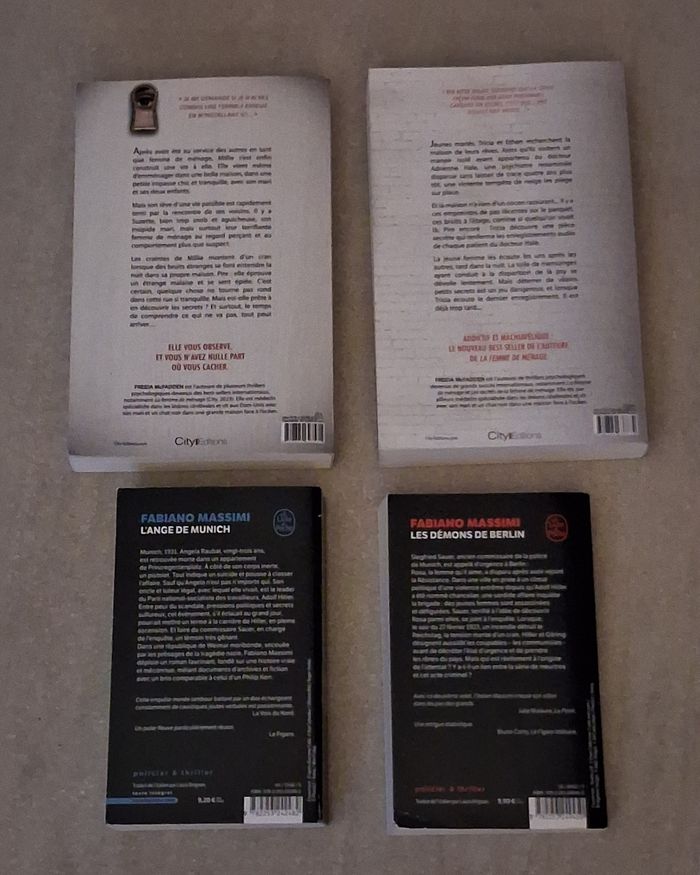Fabiano Massimi ✏️ L'ange de Munich Très bon état Prix editeur 9,20€ Edition Le livre de poche ✏️Les démons de Berlin Bon état - Quelques traces sur la couverture Prix éditeur 9,90€ Edition Le livre de poche ✏️ La Psy Freida McFadden Edition City Livre Neuf. Peut être offert Prix éditeur 21,50 € ✏️ La femme de ménage qui voit tout Freida McFadden Edition City Bon état - Quelques marques sur la couverture Prix éditeur 22,00 €