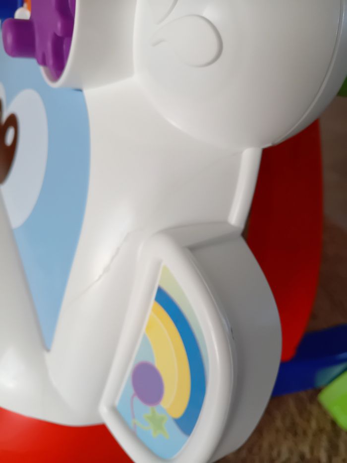 Dans son carton d'origine, démonté pour la vente. Un défaut au niveau de l'oreille qui a été recollée (cf photo 📷) mais n'empêche en rien l'utilisation. A partir de 9 mois