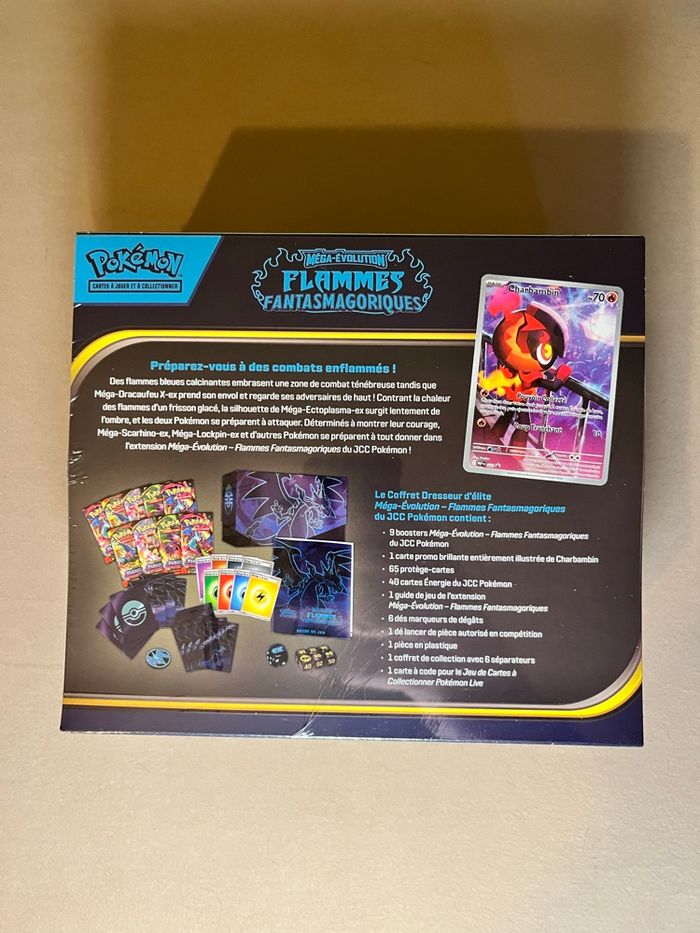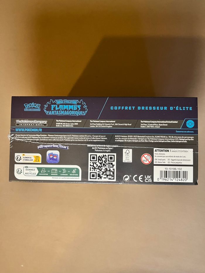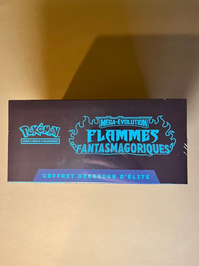 ETB (Elite Trainer Box) Pokémon ME02 – Flammes Fantasmagoriques, scellé et en parfait état. Micro trou d’usine peu visible sur la face avant (voir photo).