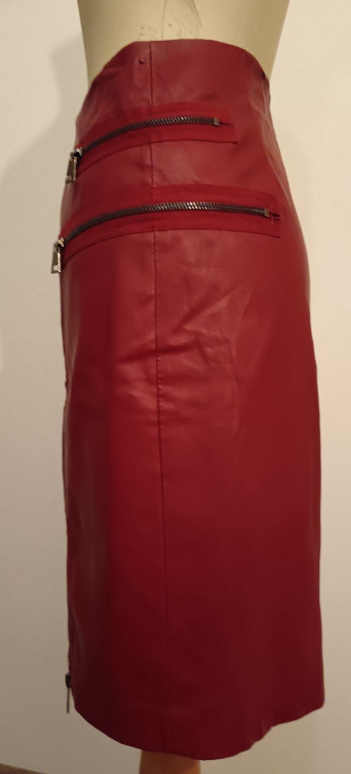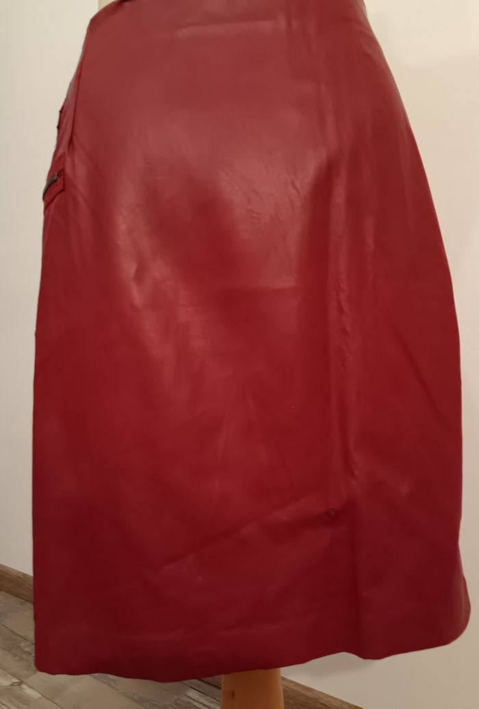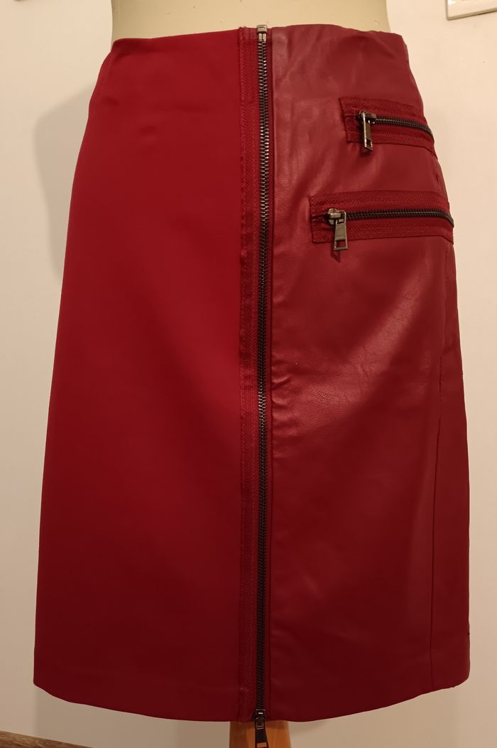 Jolie jupe mi longue bi matière. Une fermeture sur toute la hauteur devant. Deux fermeture fausses poches sur le côté. Quelques points d'usure sur la jupe Matière viscose, nylon et elasthane..