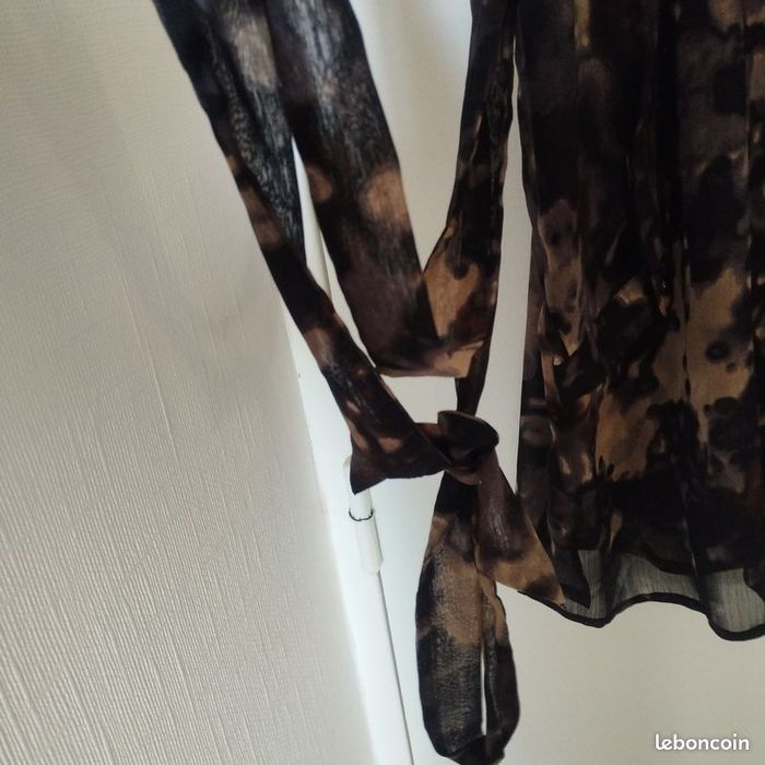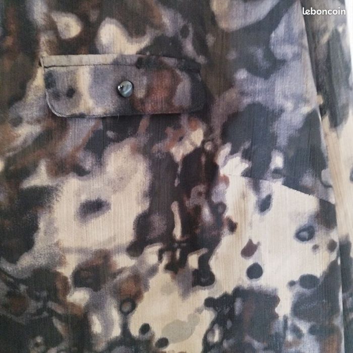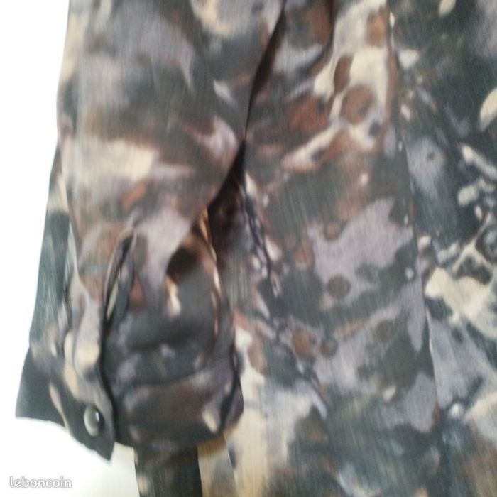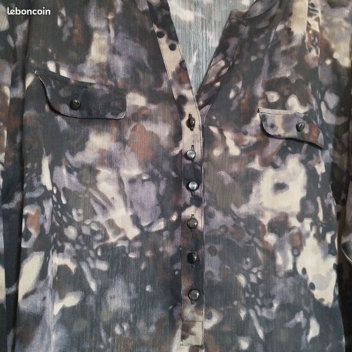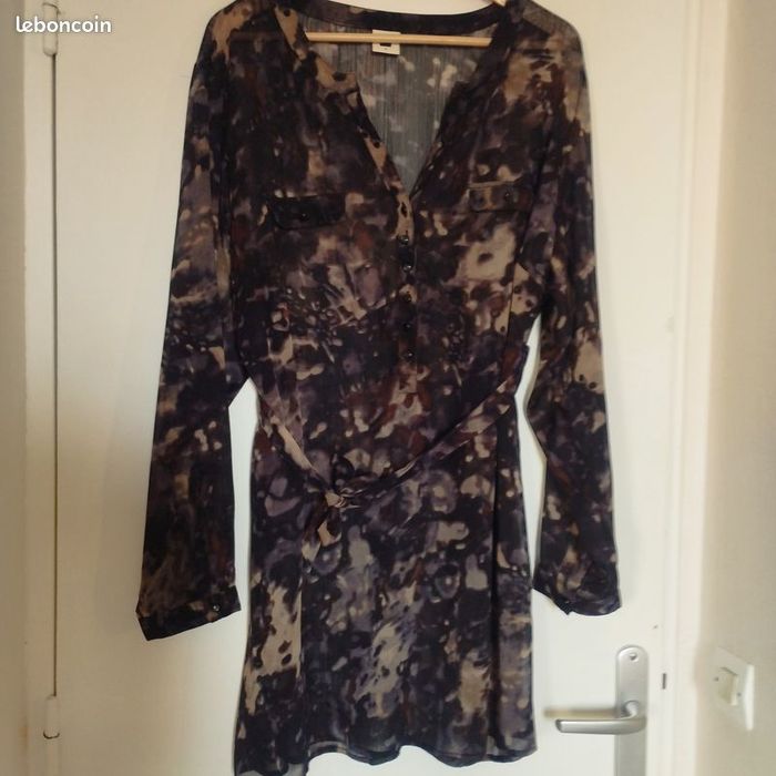 Longue tunique pour femme taille 46/48 de chez Jensen. Légère, voile, jouant dans la transparence, boutonnage sur l'avant, motif marbrure dans les couleurs noirs, beige, marron, violine. 2 fausses poches à l'avant. Poignet fermé par un bouton boule. Petite ouverture de chaque côté. Longueur86cm.