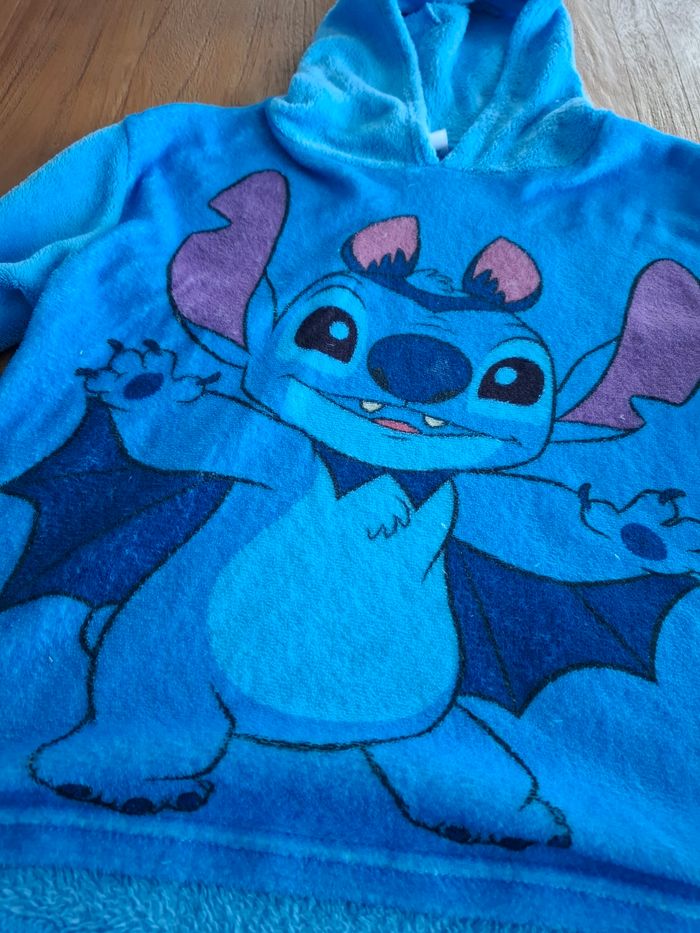 Très joli poncho à capuche Stitch (Lilo & Stitch), taille 5 ans tout doux et bien chaud. Couleur bleu vif avec grand motif Stitch sur le devant. Matière type polaire, idéale pour l’hiver ou les soirées fraîches 🌬️