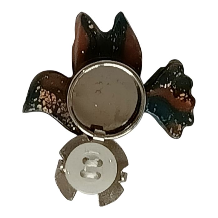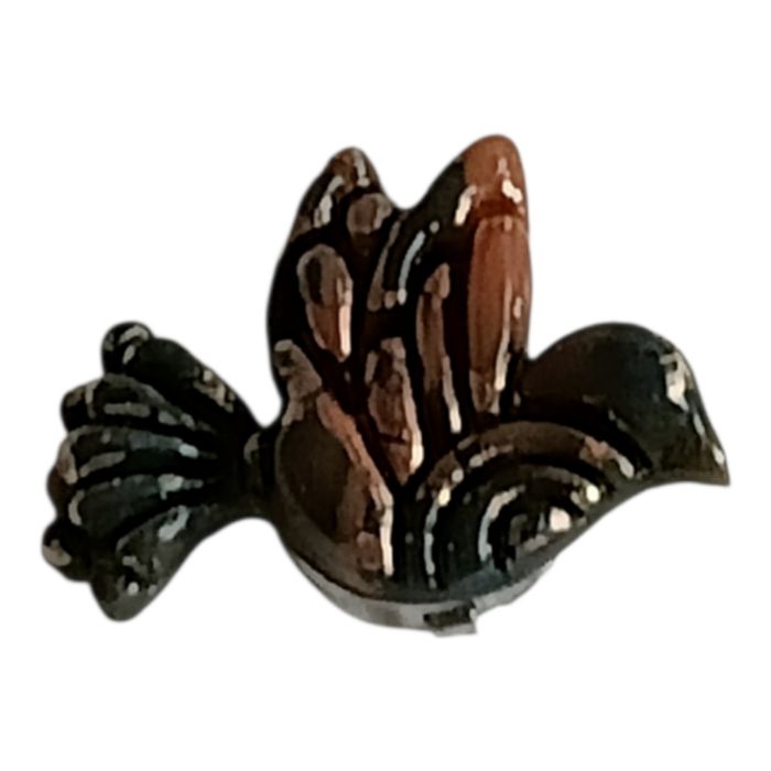 vue de face montre un petit oiseau délicat et poétique, sculpté en pâte polymère avec un effet marbré/nuancé très élégant .C'est une pièce unique, faite main, avec un design très féminin et zen, évoquant la paix . Pour chemise femme et adolescente  forme d'oiseau arrondi, queue en éventail (comme une colombe Couleurs dégradé brun cuivré / bronze foncé, avec des touches marbrées noir-vert-bleu irisé (effet moucheté ou pailleté subtil), et des zones plus claires brun clair / orangé sur le haut du corps et la queue. Matériel pâte polymère  Pour Femme et adolescente  Vernis résine UV  Création unique  Pas laisser à la portée des enfants  Dimension des boutons de chemise 1,5 Maxime