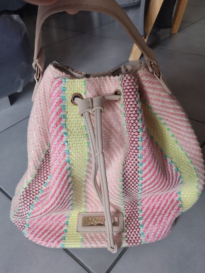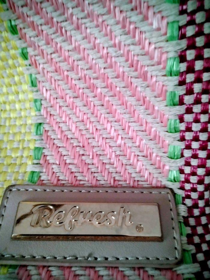 Vend Sac seau Refresh® – Tissage bohème et confort moderne 🧡 Ce sac signé Refresh® est une véritable célébration du textile : un tissage coloré et dense mêlant rose framboise, turquoise, jaune soleil et bordeaux, dans un motif diagonal et damier qui évoque les voyages, les marchés d’été et les escapades spontanées. 🎒 Fonctionnalité discrète et charme artisanal - Fermeture double : cordon en simili cuir + bouton pression aimanté - Intérieur doublé avec poche zippée pour vos essentiels - Anse souple, agréable à porter à l’épaule - Tissage résistant, léger et lumineux - Étiquette métallique Refresh® sur patch en cuir beige, gage d’authenticité