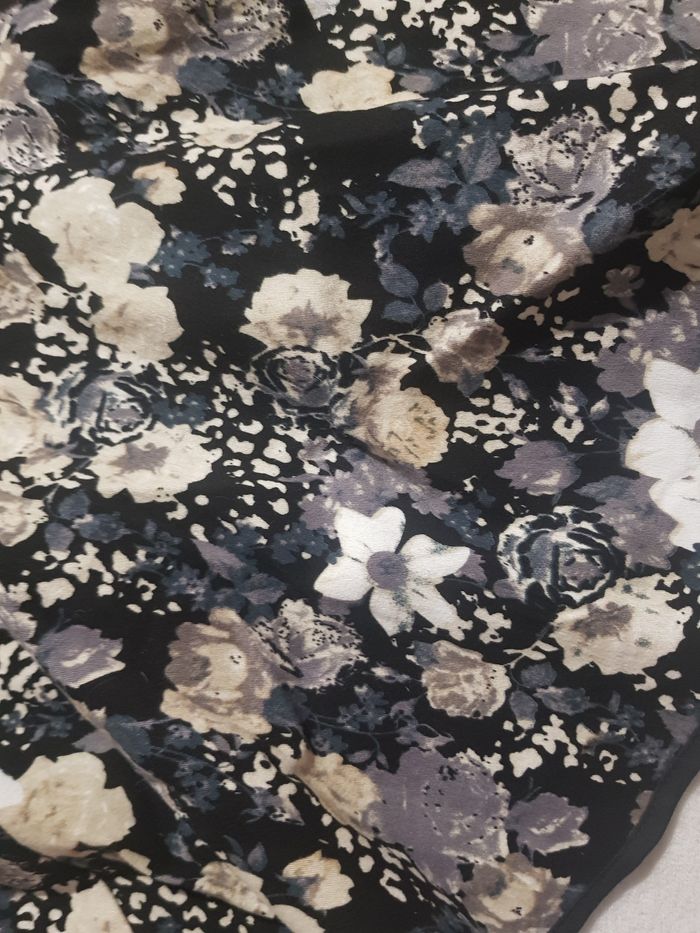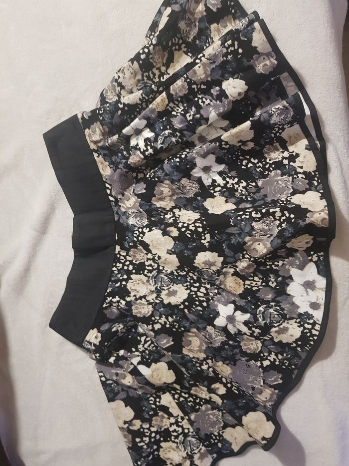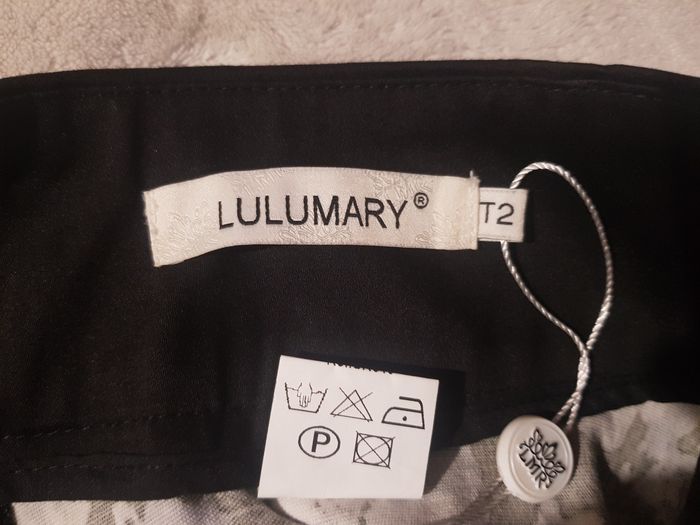 Jolie jupe Lulumary à imprimé fleuri sur fond noir. Coupe féminine, fermeture zippée, taille confortable. Tissu fluide, agréable à porter. Très bon état. Taille 2 ( 38 )