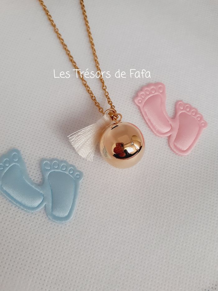🤰 Bola de grossesse composé : - d'une chaîne en acier inoxydable doré d'une longueur d'environ 105 cm. - d'une boule sonore dorée en métal de diamètre 20 mm. - d'un pompon blanc. 🌸 éviter de mettre la boule au contact de l'eau, parfum et humidité