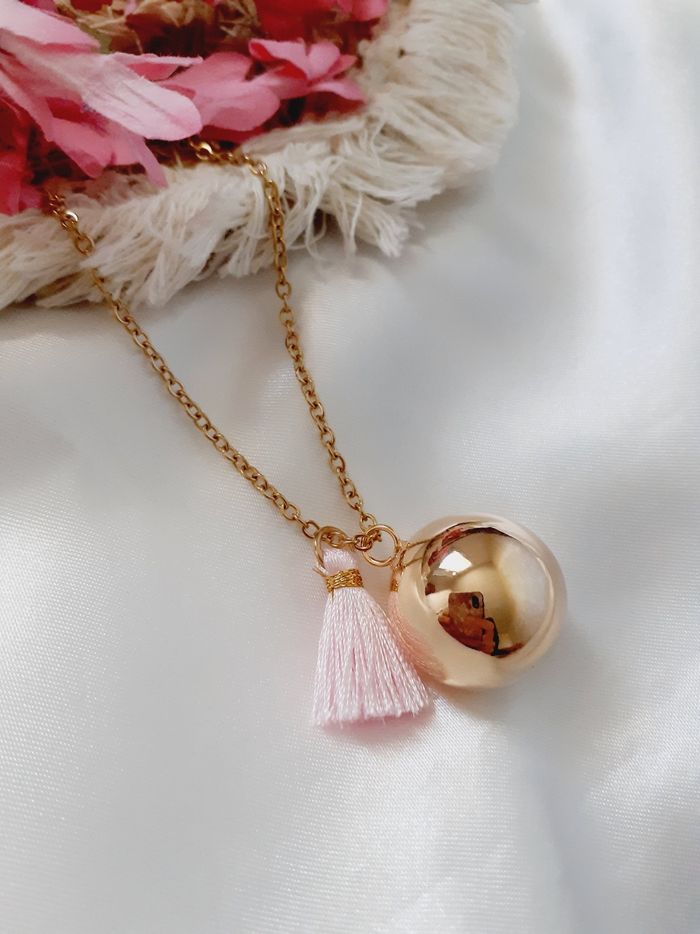 🤰 Bola de grossesse composé : - d'une chaîne en acier inoxydable doré d'une longueur d'environ 105 cm. - d'une boule sonore dorée en métal de diamètre 20 mm. - d'un pompon rose. 🌸 éviter de mettre la boule au contact de l'eau, parfum et humidité
