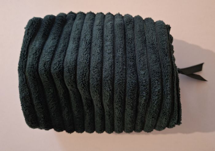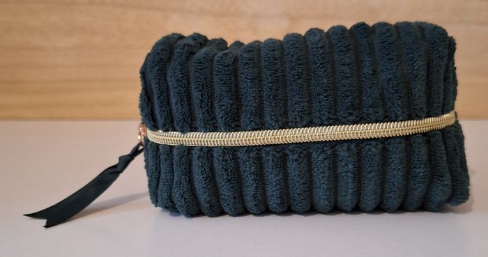 Trousse à maquillage en velours côtelé vert foncé et à fermeture éclair dorée. Hauteur 12 cm, longueur 15 cm, largeur 10 cm.
