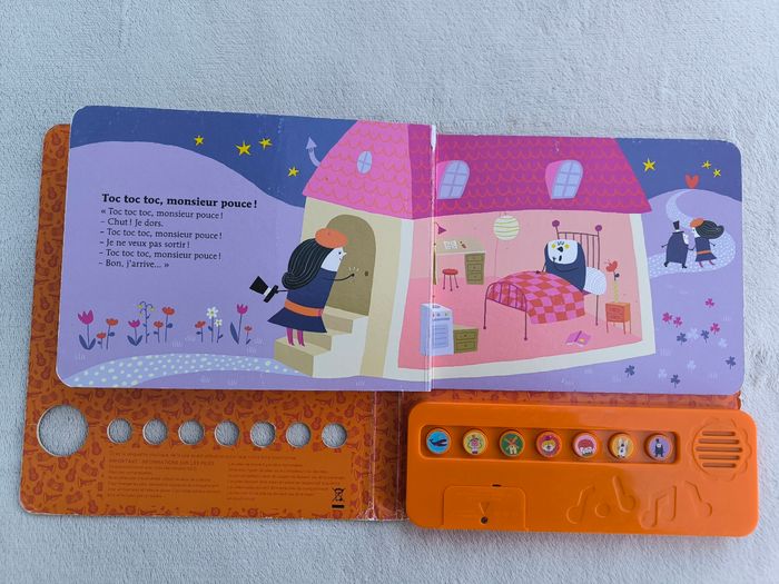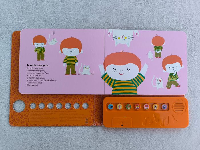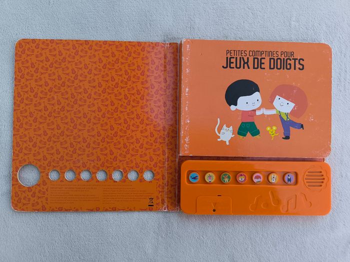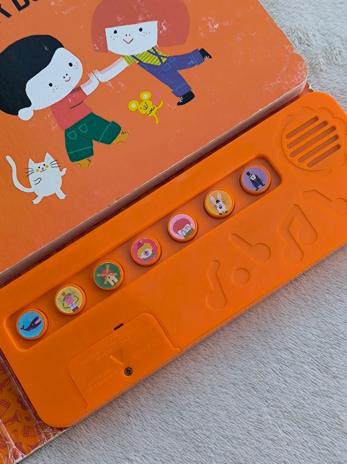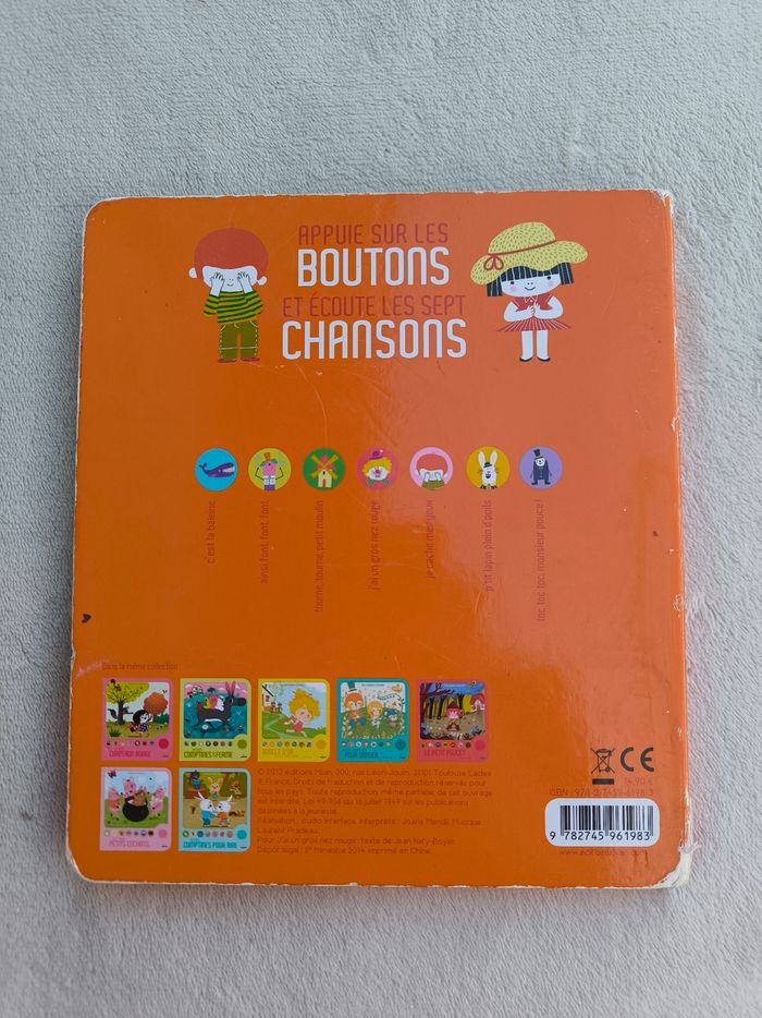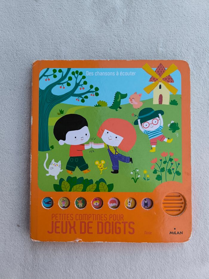 Livre sonore musical Des chansons à écouter : Petites comptines pour jeux de doigts Éditions Milan • Pages cartonnées • 7 chansons : -> C'est la baleine -> Ainsi font, font, font -> Tourne, tourne, petit moulin -> J'ai un gros nez rouge -> Je cache mes yeux -> P'tit lapin plein d'poils -> Toc toc toc, monsieur pouce ! • Une page avec pliures • Coins et arêtes abîmés ⚠️ D'autres livres dans la même collection Fonctionne Piles non incluses En bon état #evelyne_livres