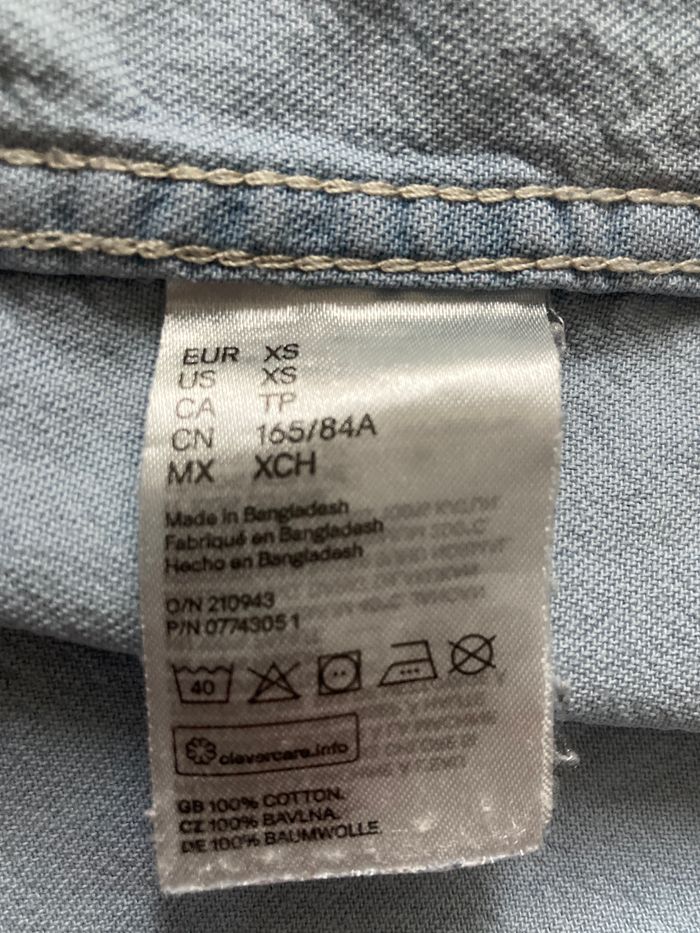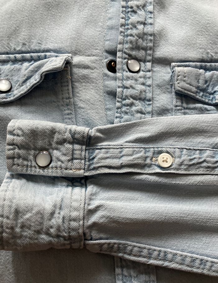 taille XS chemise aspect jeans fin bleu clair impeccable boutonnage par pression largeur au niveau des aisselles 49 cm hauteur 75 cm