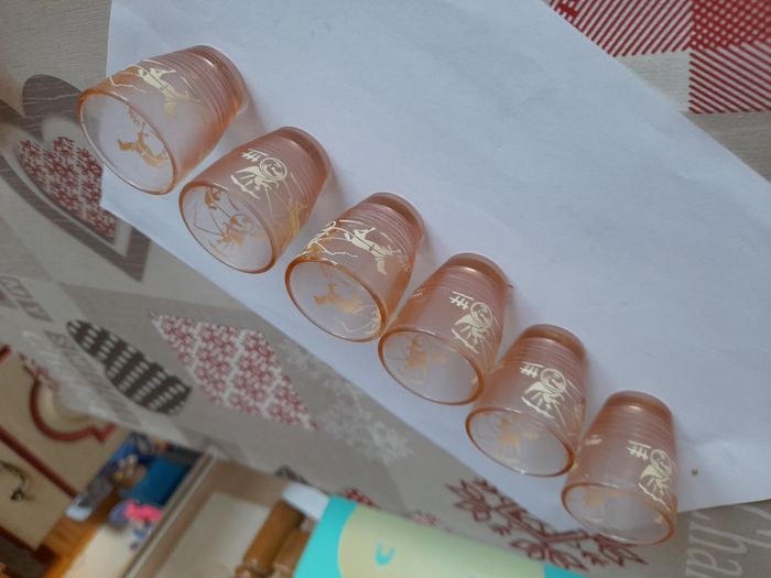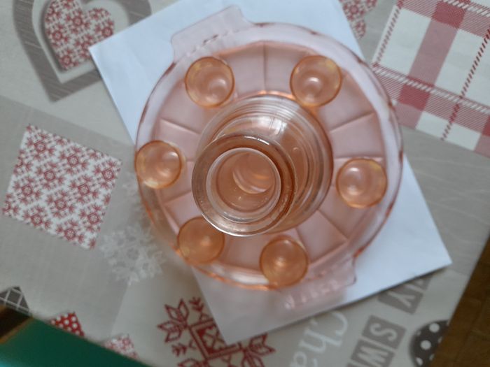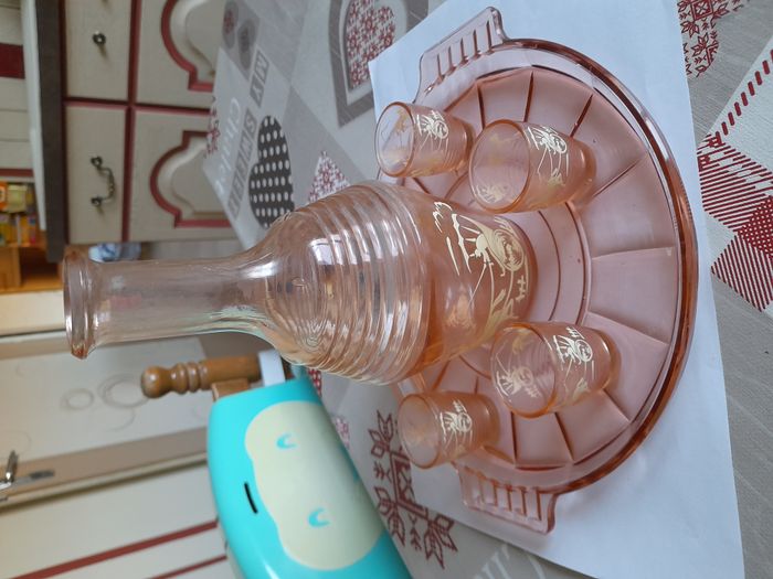 Carafe à goutte avec 6 verres sur plateau en verre rosé vintage Très bon état Carafe: hauteur 19,5 cm, il manque le bouchon, contenance 45 cl Verres: contenance 15 ml, hauteur 4,5 cm, diamètre 3,5 cm Plateau: diamètre 22,5 cm, hauteur 2 cm envoi soigné 14 euros