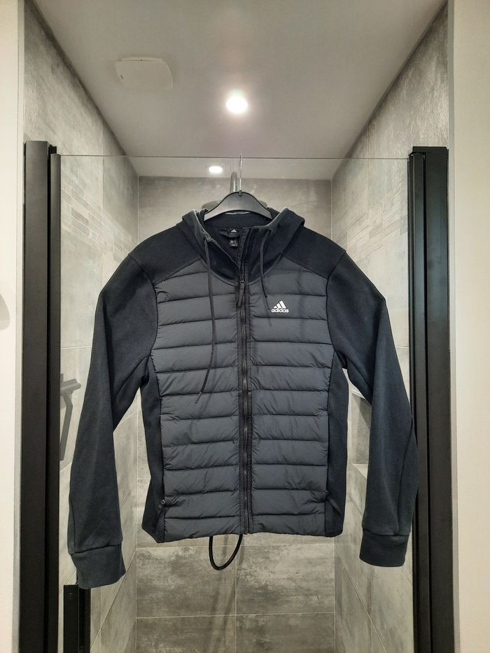 Veste / gilet Adidas en coloris noir avec effet doudoune sur l’avant, manches longues et fermeture zippée. Taille XS (équivalent S) – mesures dispo en photo. 🌟 Détails : logo Adidas brodé, design mixte doudoune + tissu technique 🧶 Matière : polyester respirant avec devant matelassé ✅ État : très bon état 📦 Envoi rapide sous 48h dans un emballage soigné et recyclable ❓ Une question ? Contacte-moi, je réponds rapidement !