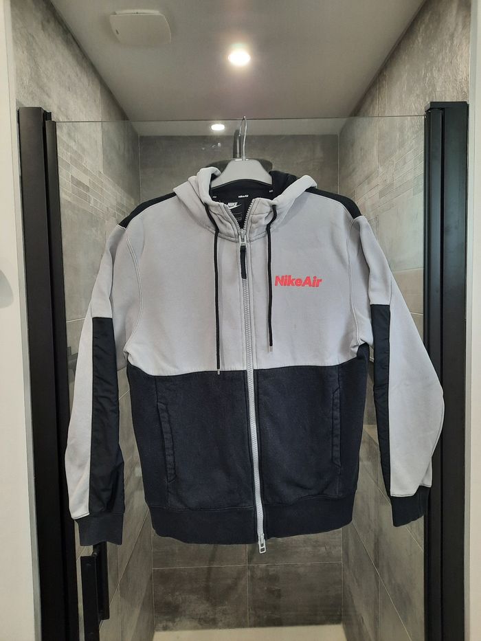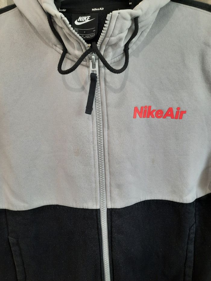 Haut de sport zippé Nike Air, coupe ajustée. Taille S Homme – mesures disponibles en photo. 🌟 Détail : logo Nike Air brodé + zip intégral 🧶 Matière : mélange technique léger et respirant ✅ État : bon état, ⚠️ petites taches discrètes sur le devant (voir photo)