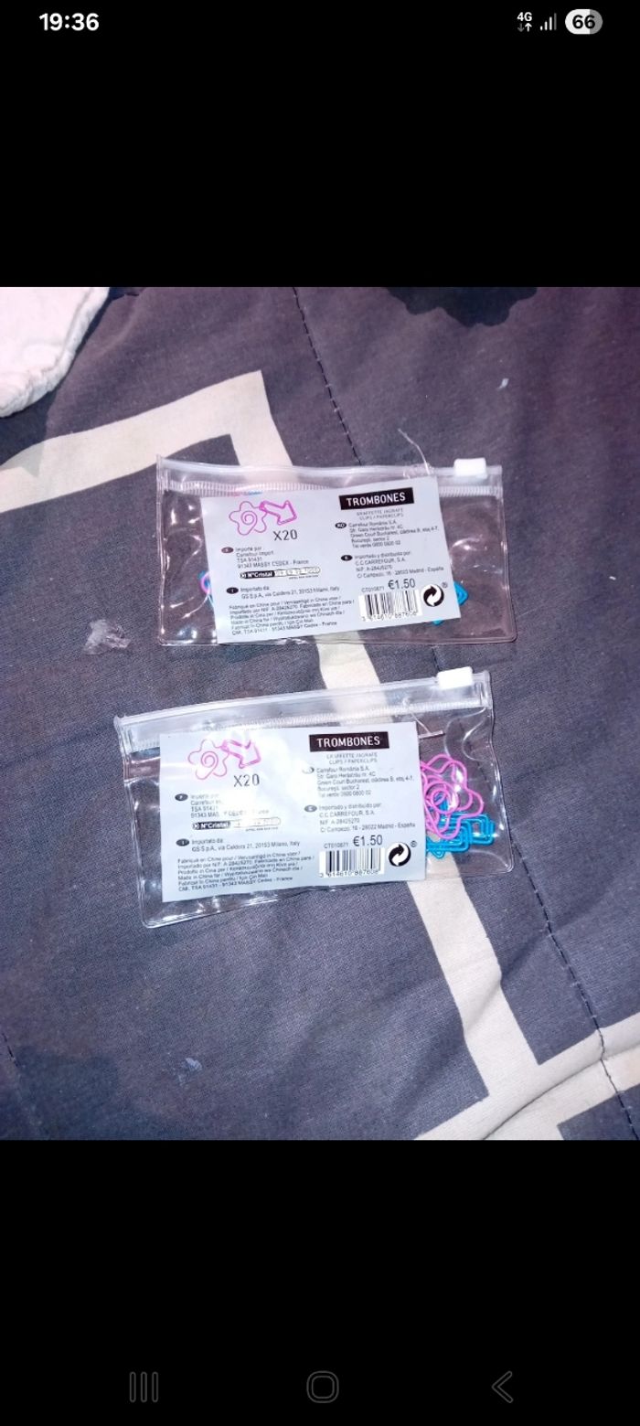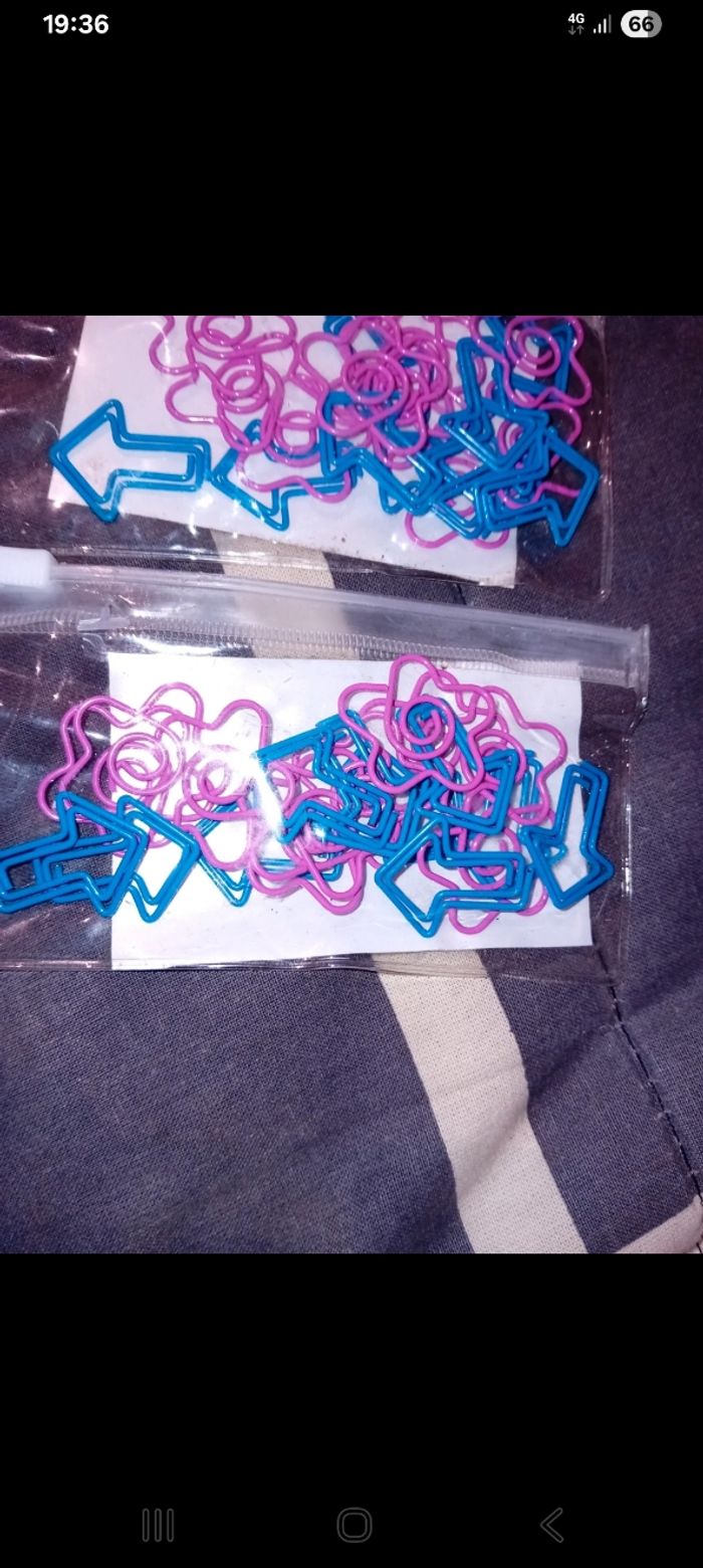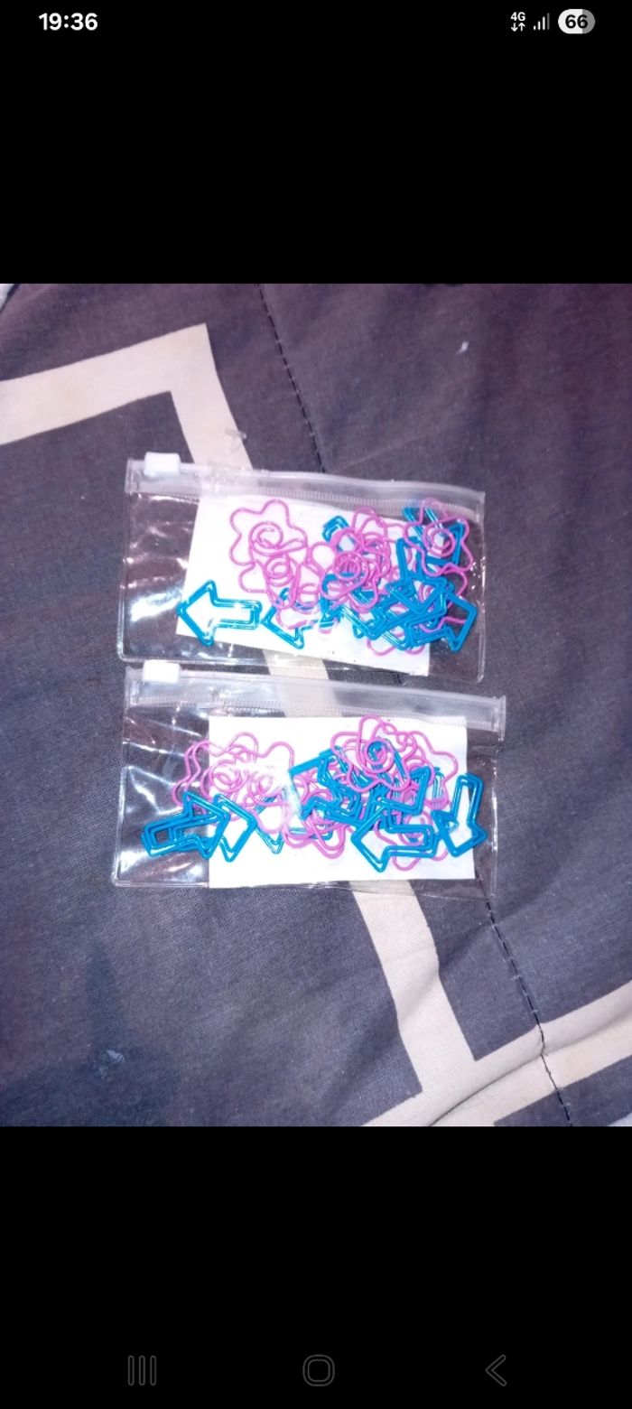 1 Sachet neuf de 20 trombones jamais ouvert et 1 sachet ouvert avec 19 trombones dedans Motifs étoiles et flèche Très bon etat