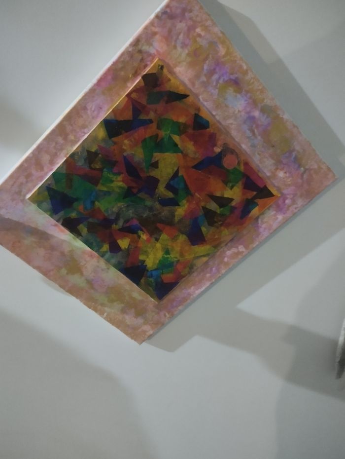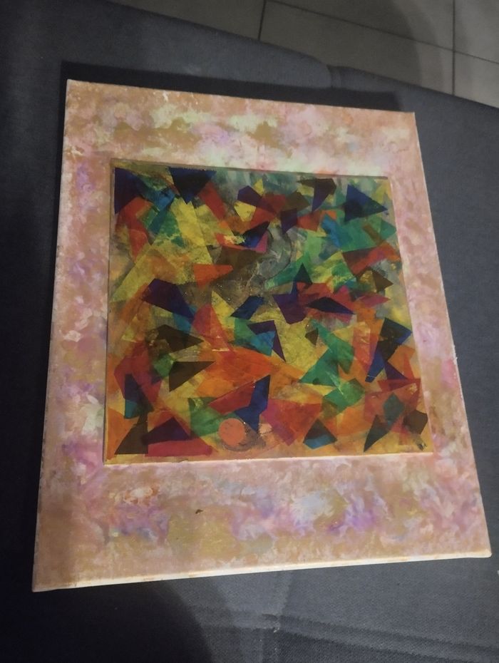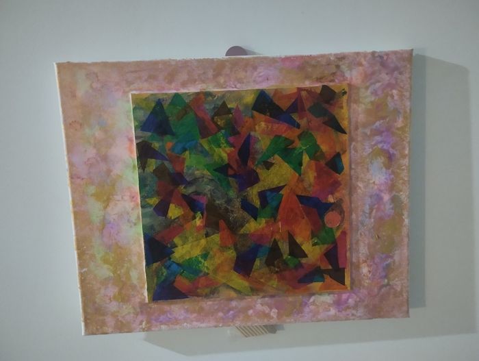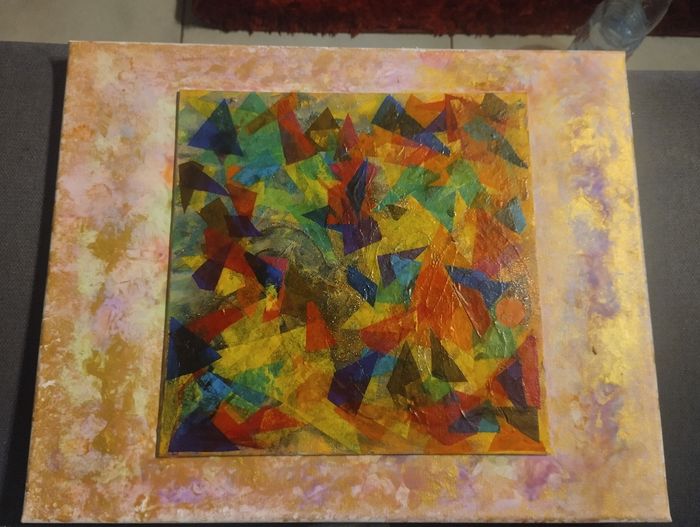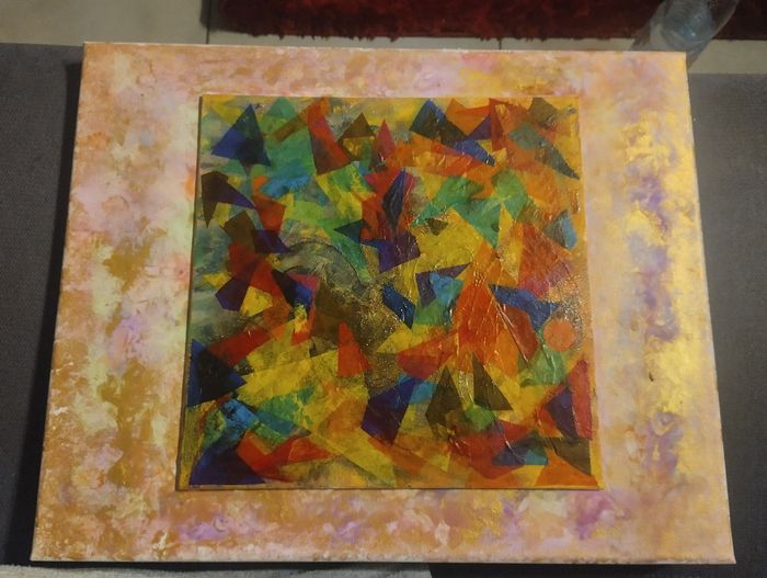 Description premium et séduisante : Œuvre abstraite unique composée de deux éléments : un petit cadre coloré, rempli de formes géométriques vibrantes, soigneusement collé sur un cadre plus grand. Cette superposition crée un effet de profondeur très moderne et donne à la pièce une présence visuelle forte. Les couleurs se mêlent avec transparence et lumière, offrant un rendu dynamique et harmonieux. Une légère trace de peinture traverse la toile et un petit voile coloré apparaît sur le côté : ces détails authentiques témoignent du geste artistique et renforcent le caractère original de l’œuvre. Un tableau lumineux, contemporain et plein de personnalité, idéal pour apporter une touche artistique qui attire immédiatement le regard dans n’importe quel intérieur. ---
