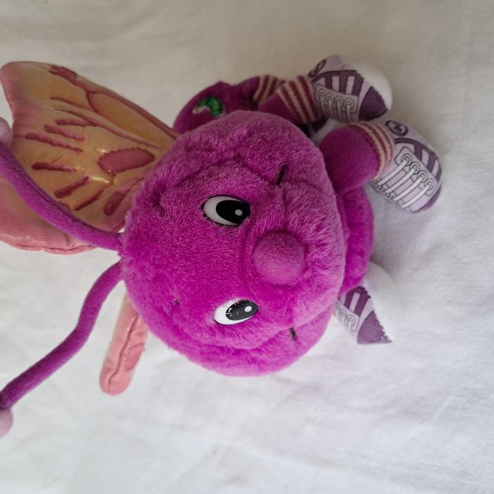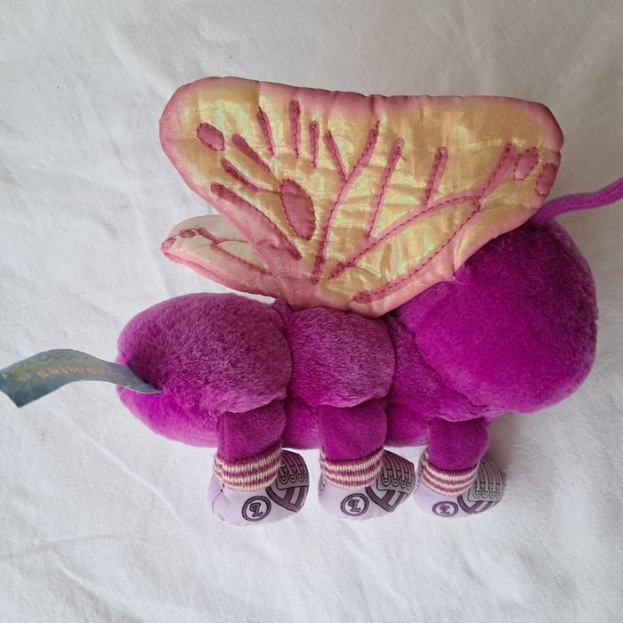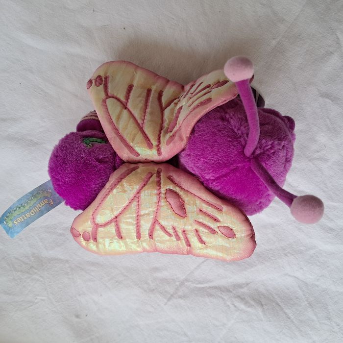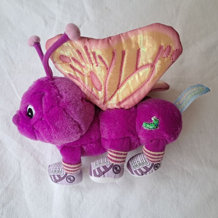 Peluche doudou chenille papillon violet ailles jaunes et rose Familipattes Lansay 1999 Longueur : 18 cm Hauteur : 10 cm Poids : 100 grammes Très bon état voir photos