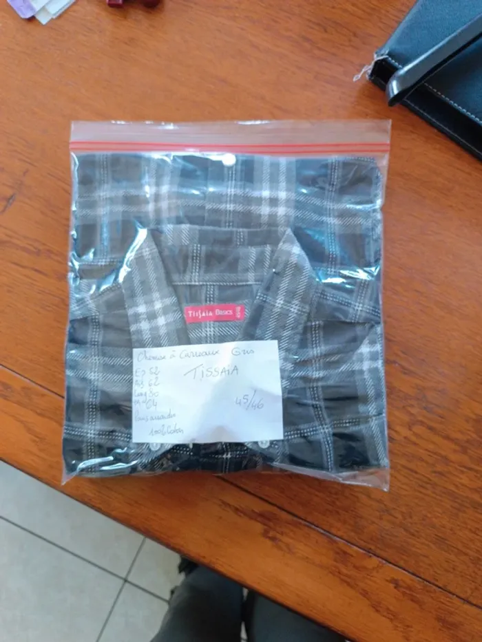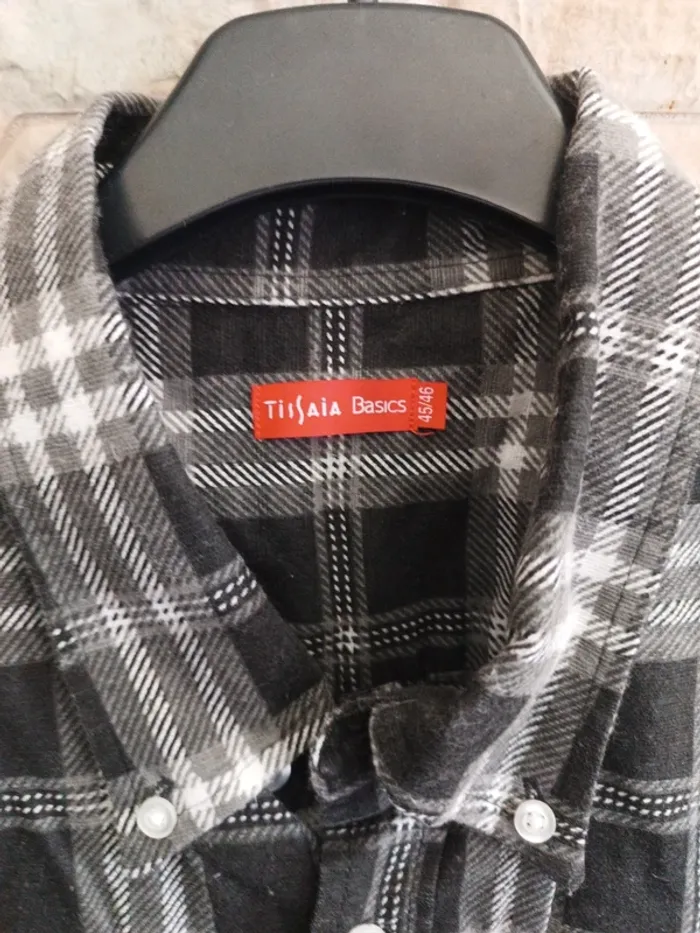 Chemise à carreaux gris Tissaia XXL - 45/46. Épaules 52 cm. Aisselles 62 cm. Longueur 80 cm, pans arrondis. Manches longues 64 cm. 100% coton. Jamais lavée. Encore empesée. Neuve.