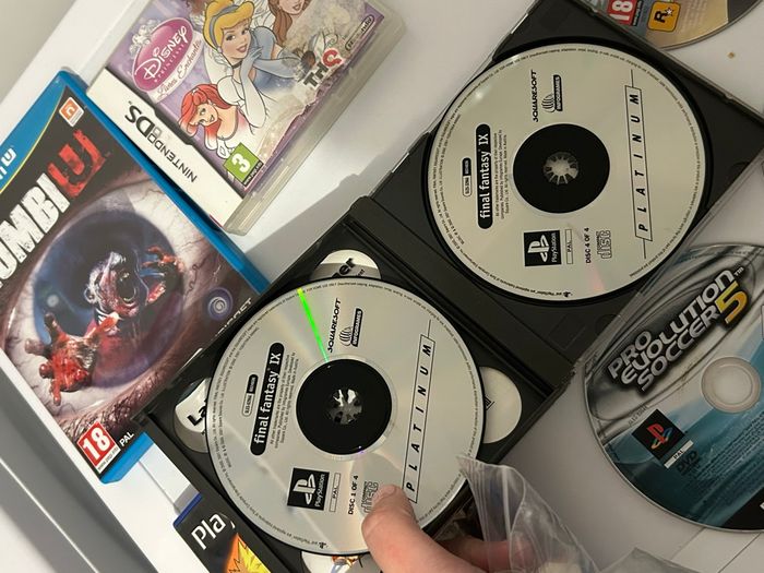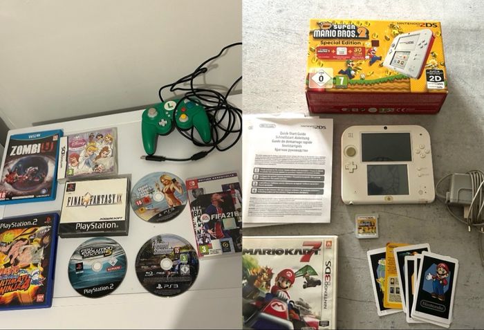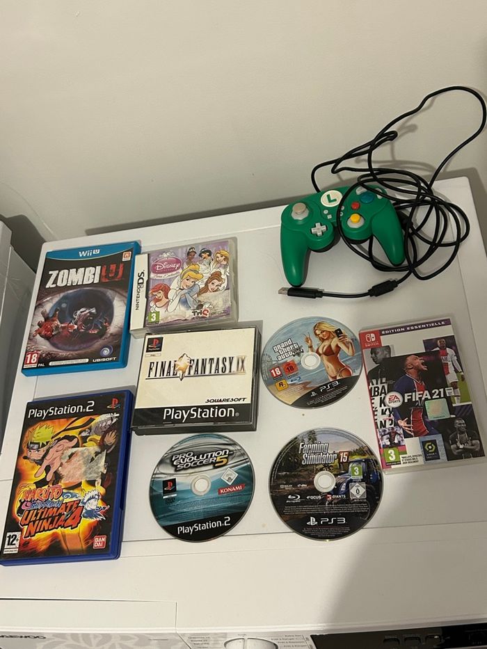 ZombiU (Wii U) : 10€ Disney Princesses (DS) : 4€ Final Fantasy IX (PS1, boîte) : 10€ manque ce disque 2 et boîte un peu cassée. Naruto Ultimate Ninja 4 (PS2) : 4€ bien rayé mais fonctionnel PES 5 (PS2, disque seul) : 2€ GTA V (PS3, disque seul) : 3€ Farming Simulator 15 (PS3, disque seul) : 3€ FIFA 21 (Switch) : 8€ Manette Switch Oled luigi verte : 8€ - Console Nintendo 2DS édition New super Mario bros 2 avec le jeu inclus et le jeu Mario kart en plus Vendue avec sa boîte d’origine, un chargeur , les cartes amiibo, les notices d’origine. La console fonctionne très bien elle est en bon état général malgré son âge très légères rayures au dos de la console : 90€ Tout le lot complet : 130