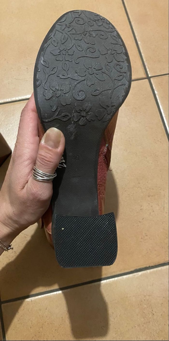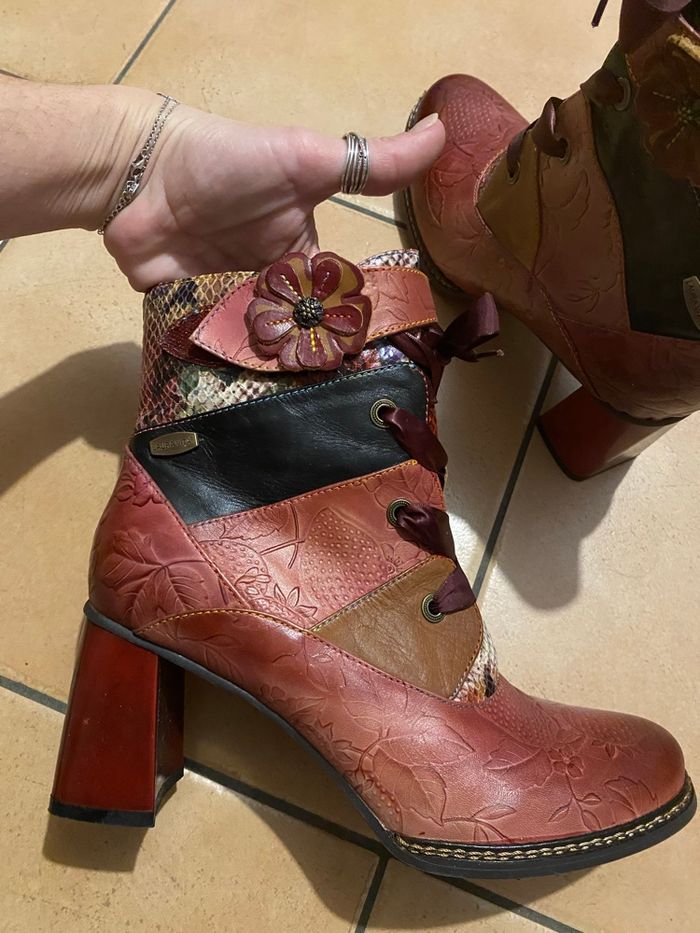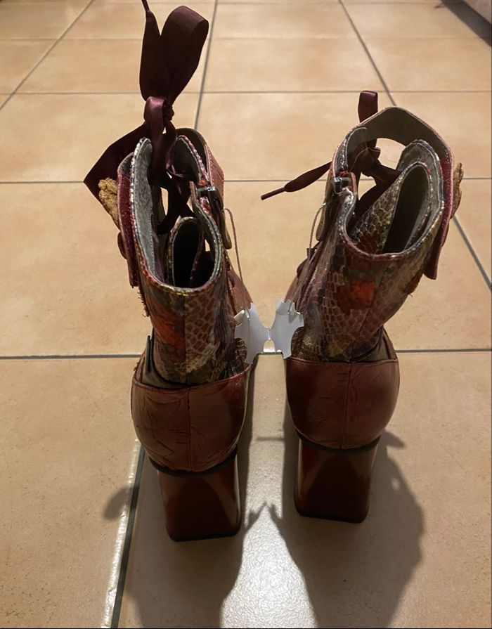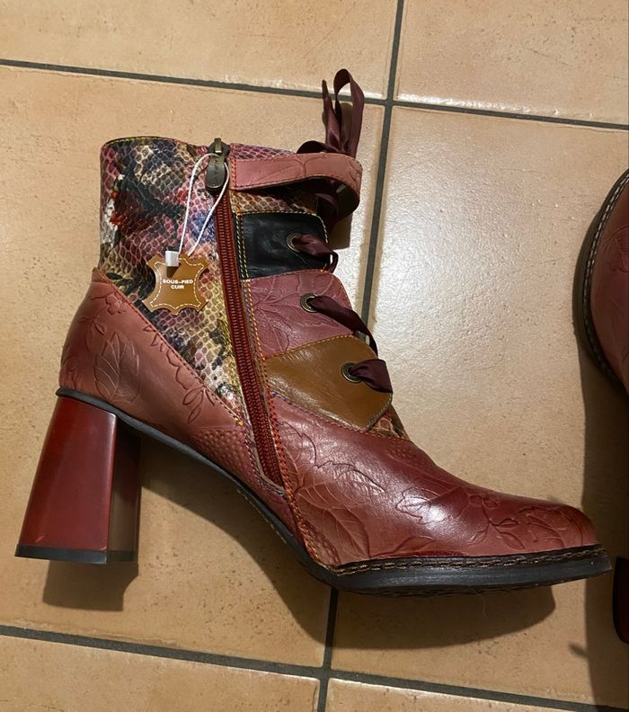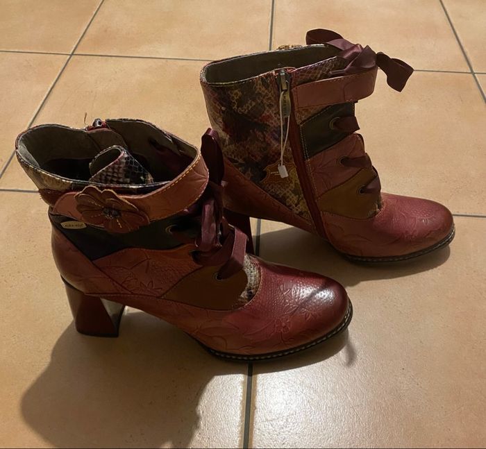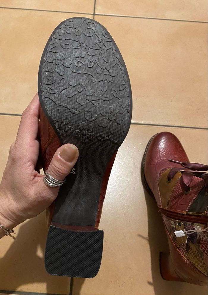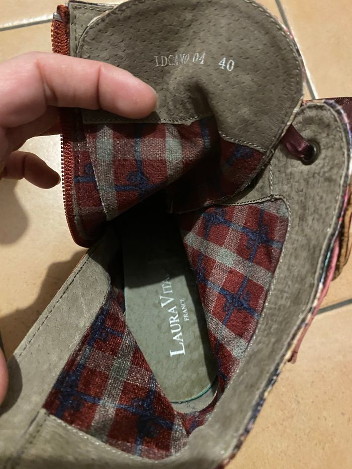 Bottines en taille 40 Marque : Laura Vita Modèle : IDCANO 04 Hauteur talon : 7,5 cm Non porté Petit défaut du cuir sur l’une d’elle (voir dernière photo)
