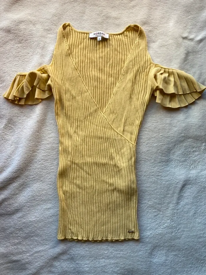 Haut Jaune à Volants – Morgan – Taille S ✨ Lumineux, féminin & tendance Magnifique haut Morgan en maille plissée, coloris jaune vif, idéal pour illuminer vos tenues. Son décolleté cache-cœur et ses manches volantées apportent une touche chic et élégante, parfaite pour la belle saison. Détails produit : • Marque : Morgan • Taille : S • Couleur : Jaune vif – éclatant et solaire • Matière : Maille plissée, extensible et confortable • Coupe : Ajustée, féminine et flatteuse • État : Très bon état 📦 Expédition rapide et soignée