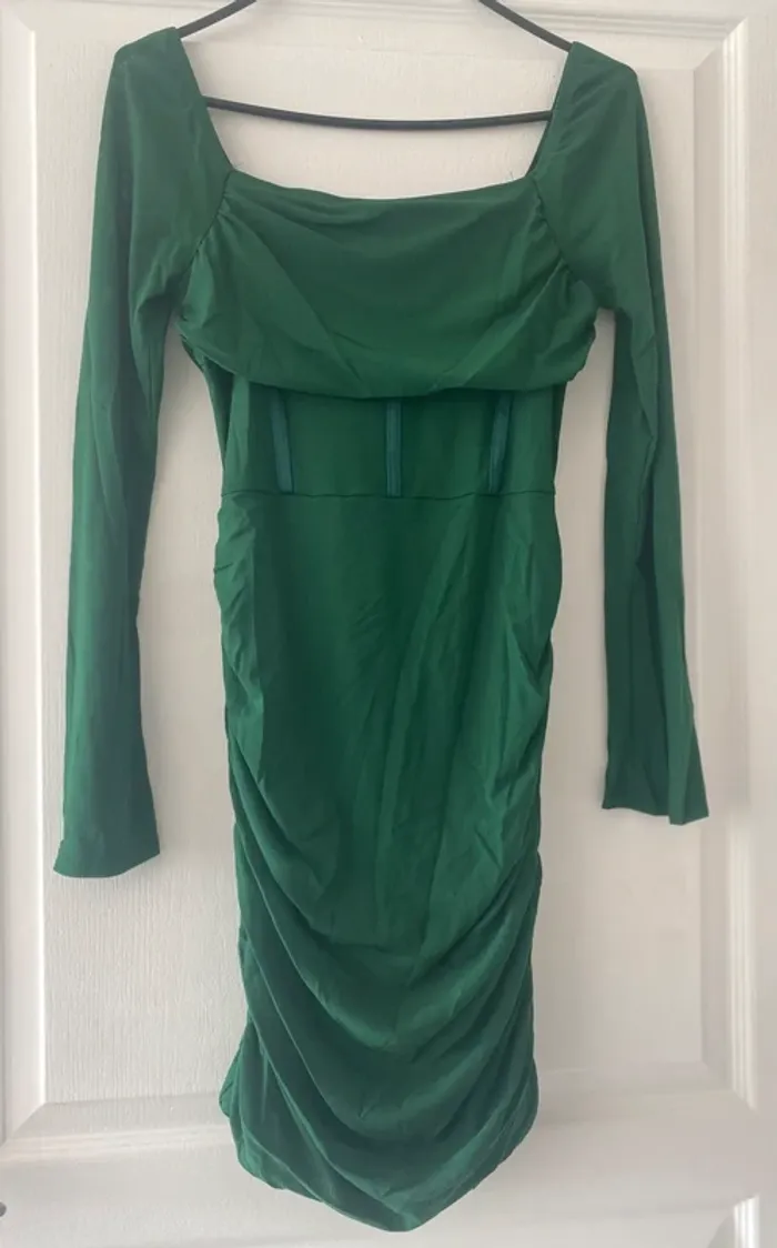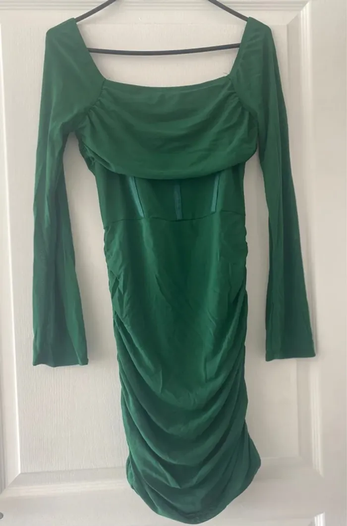 Robe vert Froncée Corset – My Look Féminin – Taille Unique ✨ Élégante, moulante & tendance Superbe robe de soirée / cocktail signée My Look Féminin, idéale pour un look chic et sophistiqué. Détails produit : Couleur : Vert sapin Matière : Confortable et légèrement stretch pour un effet moulant parfait Coupe : Bodycon (moulante), avec fronces (ruches) sur la jupe Détails : Effet corset à la taille, décolleté drapé, manches longues Taille : Taille Unique (convient généralement du XS au M) État : Très bon état 📦 Expédition rapide et soignée