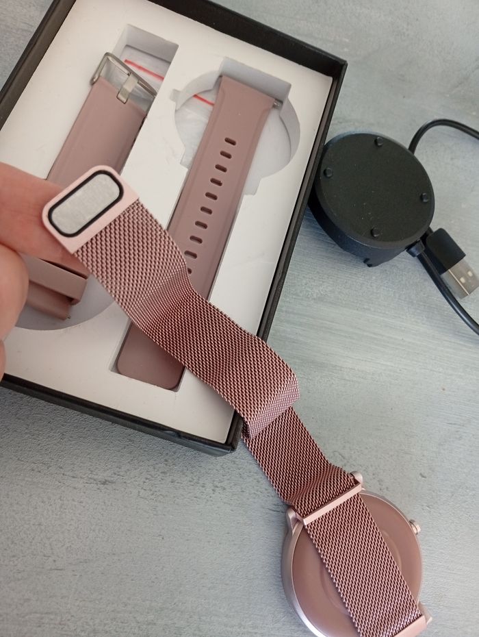 Cette montre connectée à 2 bracelets une aimanté l' autre en caoutchouc.