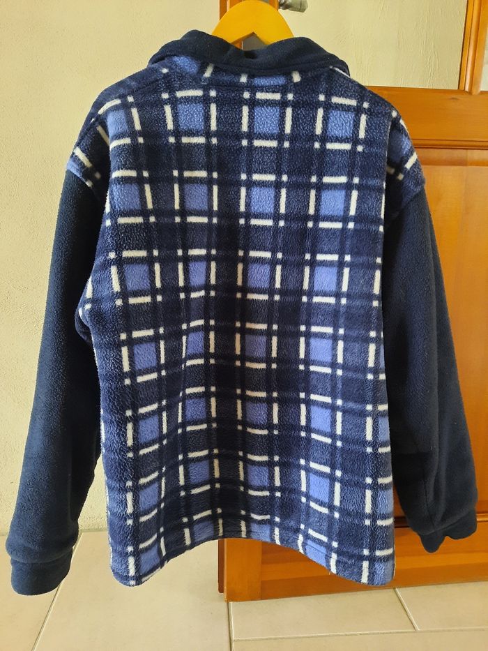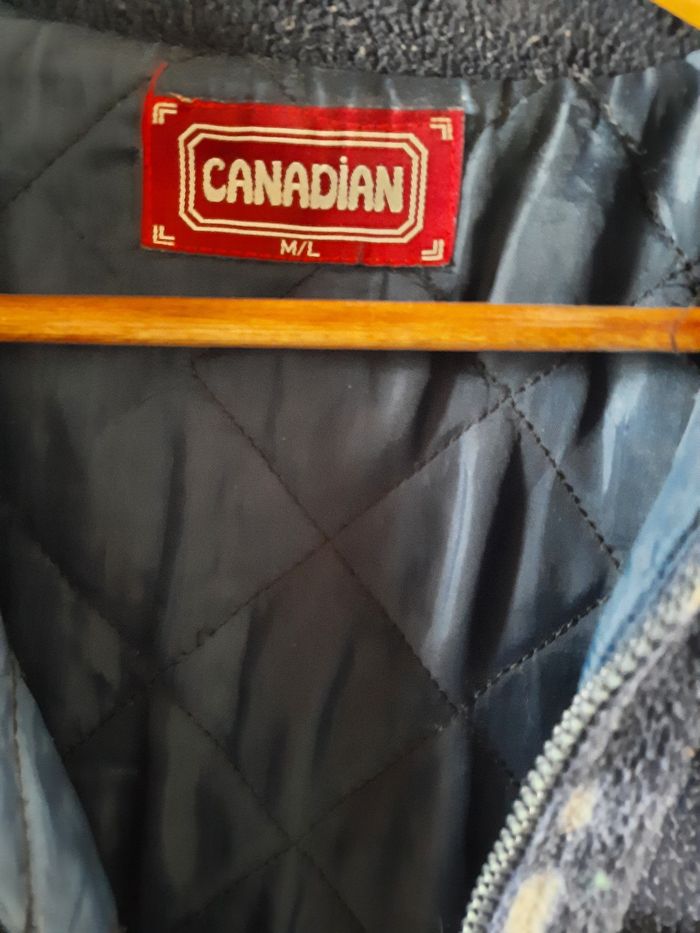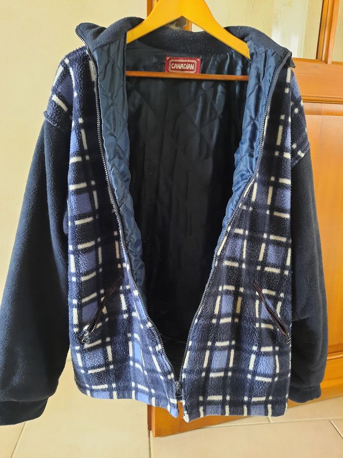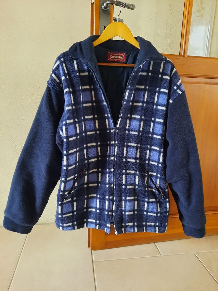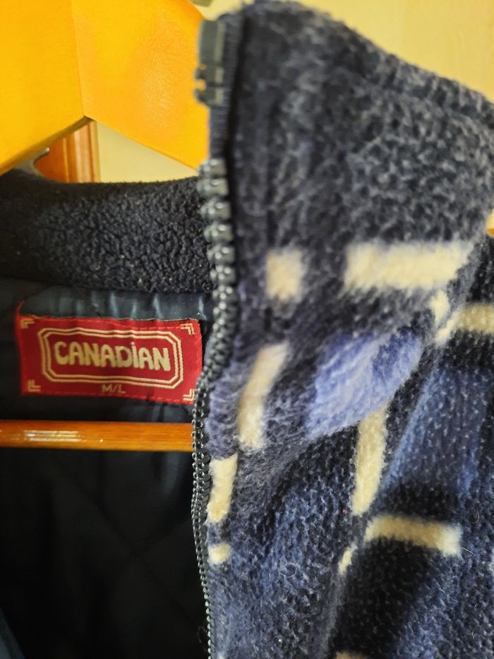 Taille M / L Marque Canadian 2 poches zippées fonctionnelles Fermeture éclair fonctionnelle (manque juste 2 crans de la Fermeture éclair tout au dessus vers le col - voir sur la dernière photo). Bleu marine à carreaux bleu clair et blanc Hauteur 73 cm Largeur épaule à épaule 62 cm Longueur manche 62,5 cm État bon / satisfaisant