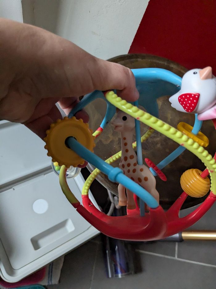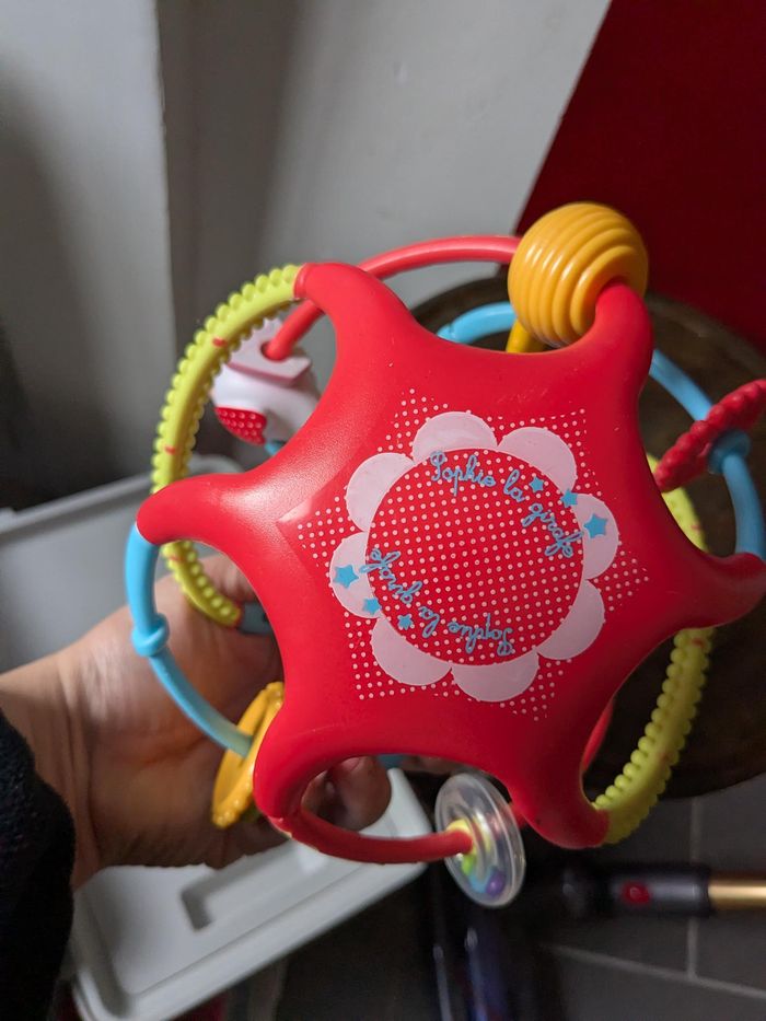 Sophie la girafe balle jouet d’éveil twistin’ball 6 tiges grande taille Légère bébé s’amuse à l’agiter pour faire tinter les billes qui s’entrechoquent et faire coulisser les anneaux et perles le long des tiges Développer la motricité fine 16cm