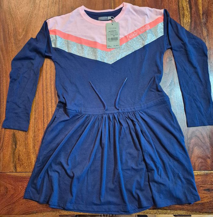 Robe mi longue marque Canada House à enfiler Canada House est une marque de vêtements espagnole Couleur originale avec bandes sur le haut pour un look stylé Col rond Poches sur côté Lien à la taille pour la resserrer 12 ans 100% coton Neuve avec étiquette