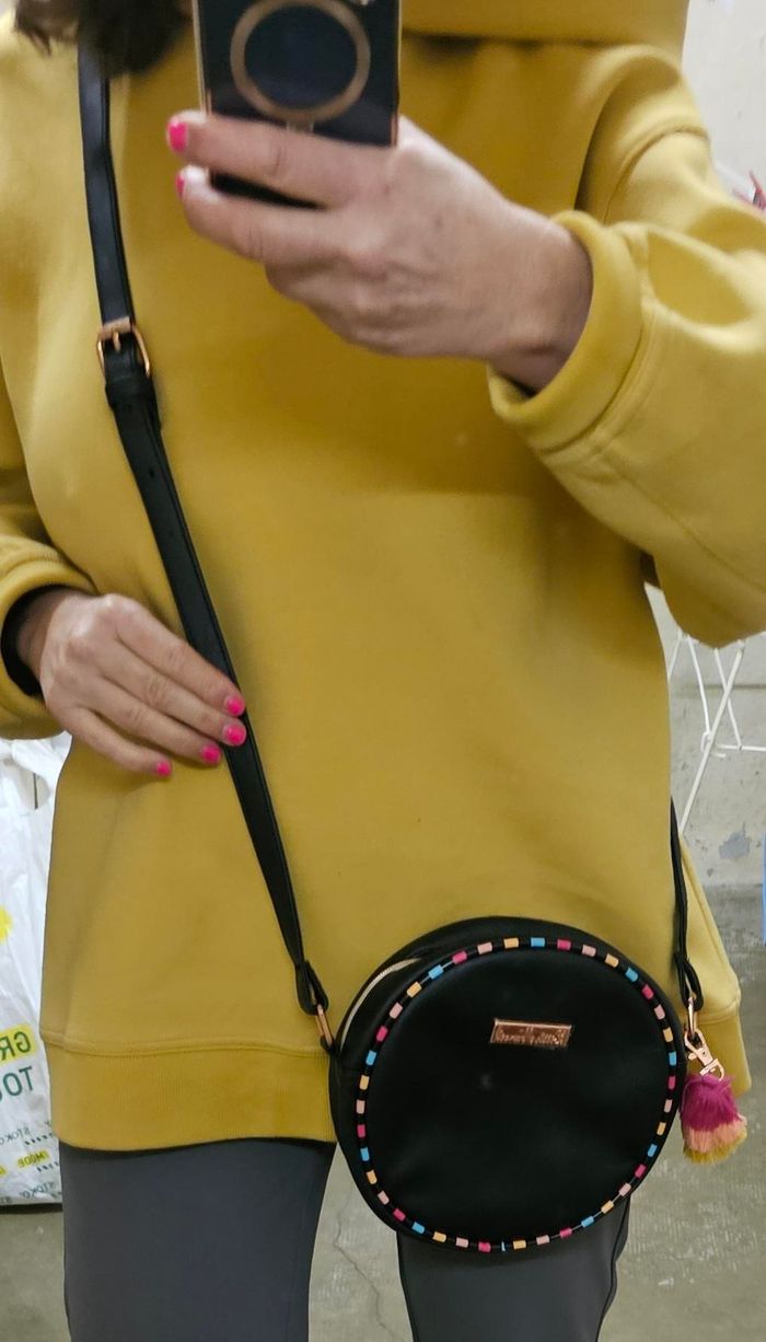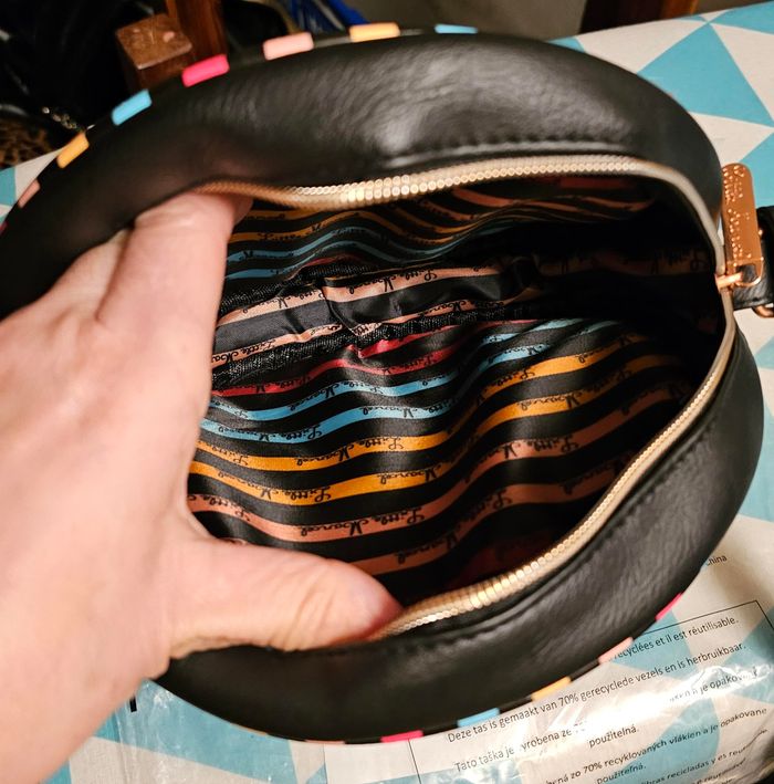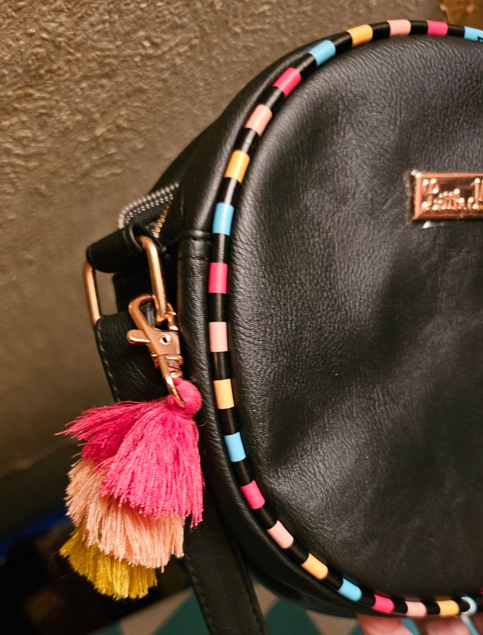 Sac Tambourin noir avec fermeture Bandoulière réglable Pompon sur le côté Jolie doublure riche en couleur Simili cuir Neuf sans étiquette