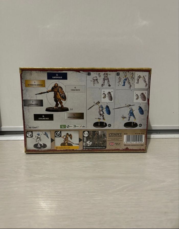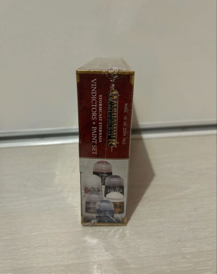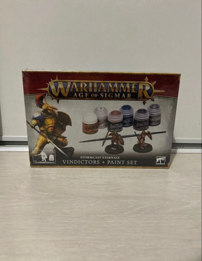Boîte Stormcast Eternals Vindictors + Paint Set, parfaite pour débuter Age of Sigmar. Contenu : • Figurines Vindictors Stormcast Eternals • Peintures Citadel incluses • Pinceau Citadel • Figurines en plastique, non peintes, non montées État : Neuf / sous blister Produit officiel Games Workshop.