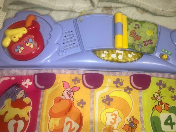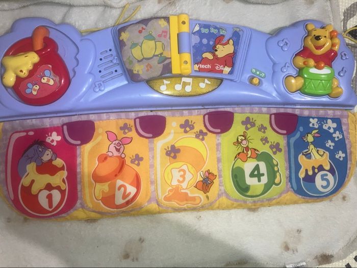 Piano Winnie l’ourson en tres bon etat marche parfaitement bien juste l’es autocollant sont décollé niveau livre on peut l’attacher dans un lit grâce au ficelle et la housse piano es scratchable et lavable.