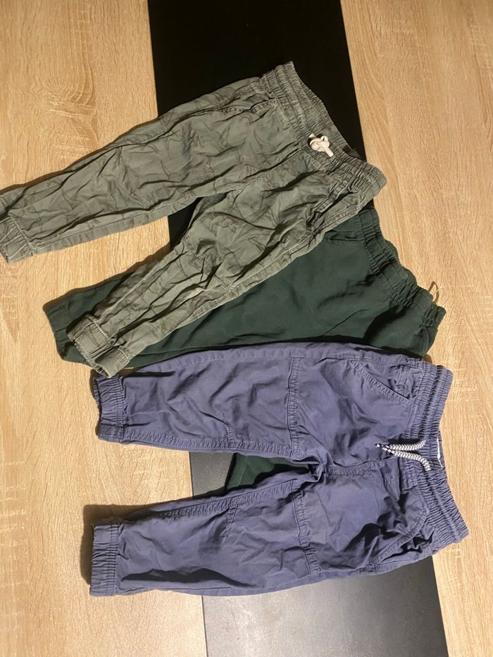 - Un jean bleu, marque gemo - Un jean vert avec des dinosaures, marque h&m - un jogging