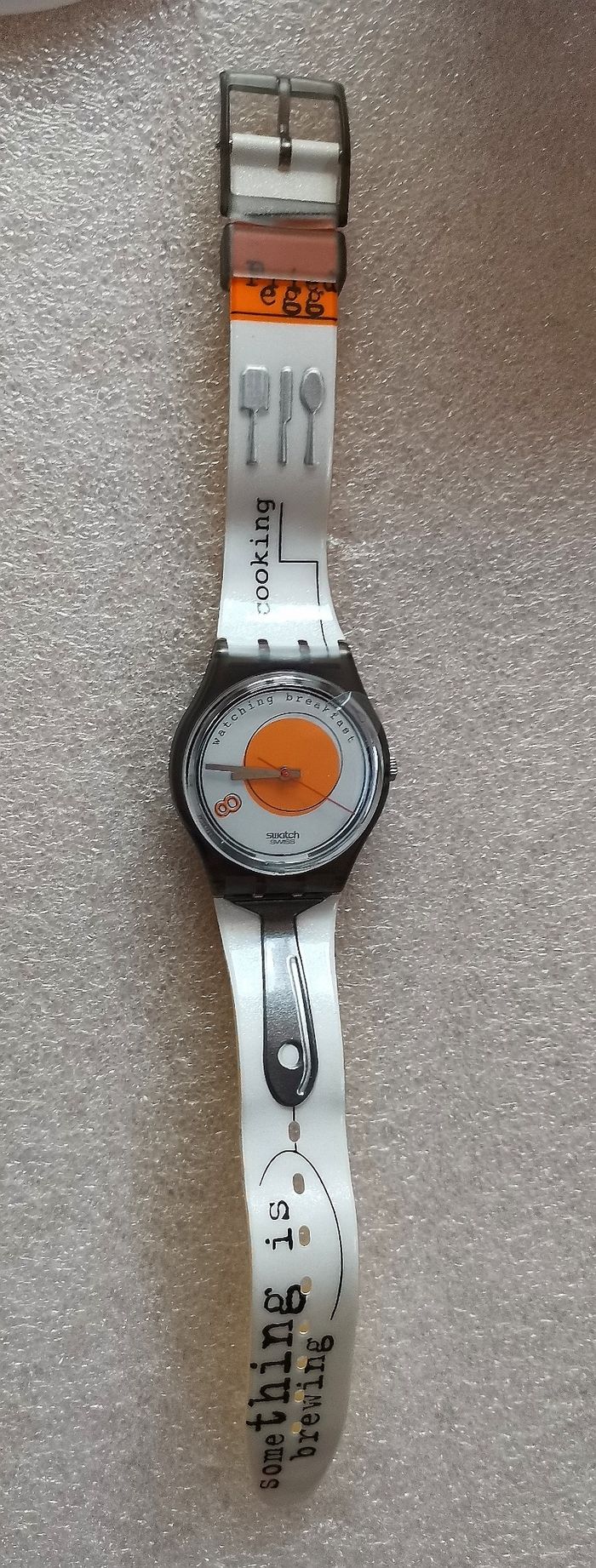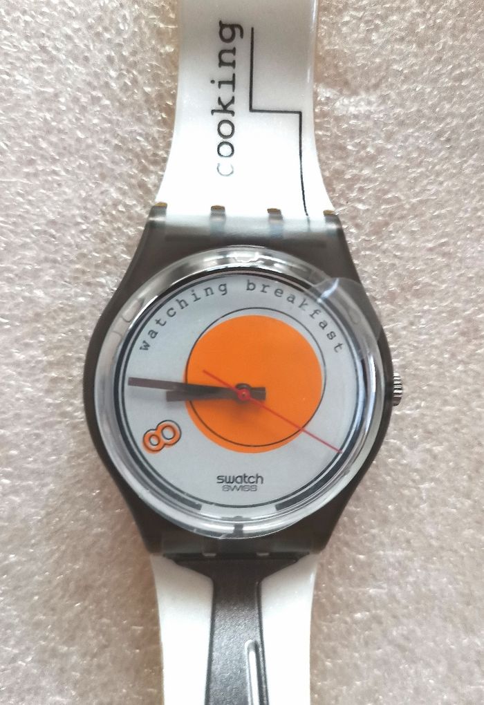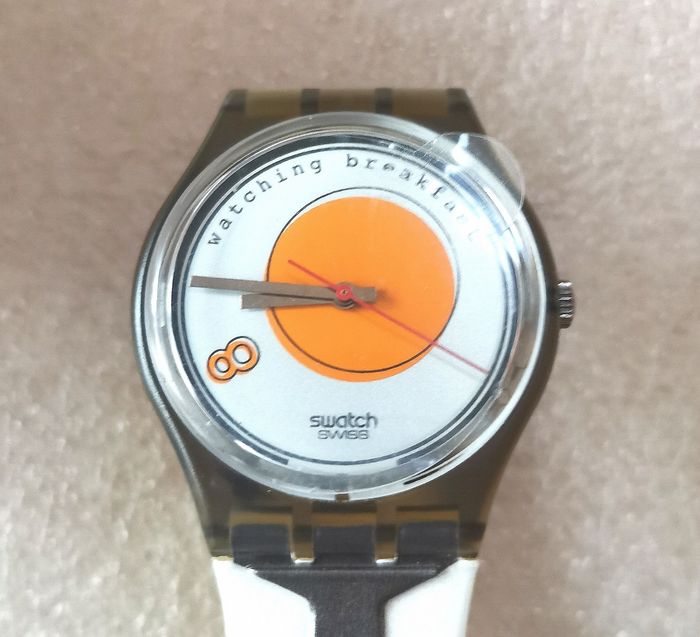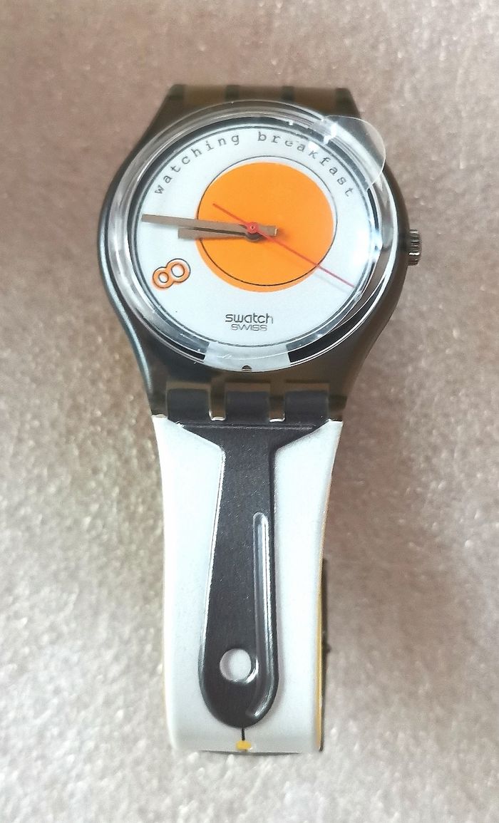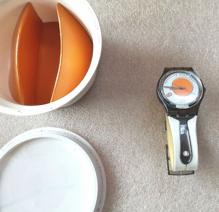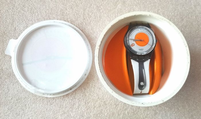 Pack Collecteur SWATCH "Sunny Side Up", GM 135, Collection Gents 1995, boîtier gris translucide de 34 mm à intérieur au milieu cercle orange sur fond blanc, aiguilles argent et trotteuse rouge, jamais porté, encore avec sa protection d'écran et bracelet d'origine, jamais porté, mais vintage, la matière se fragilisé avec le temps, craquelé, en parfait état de fonctionnement, pile fourni, prix définitif.