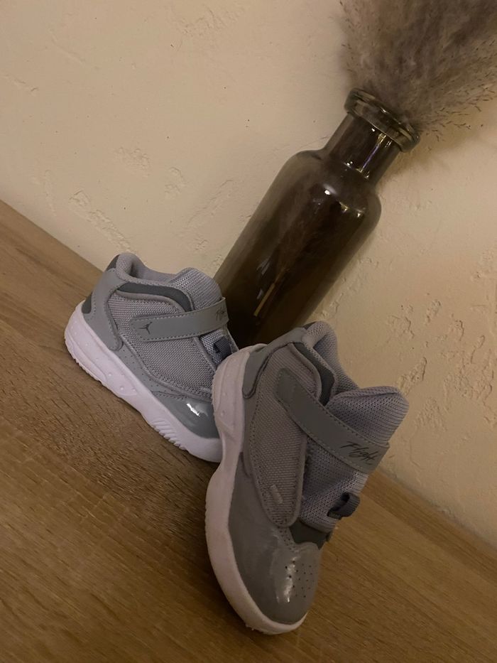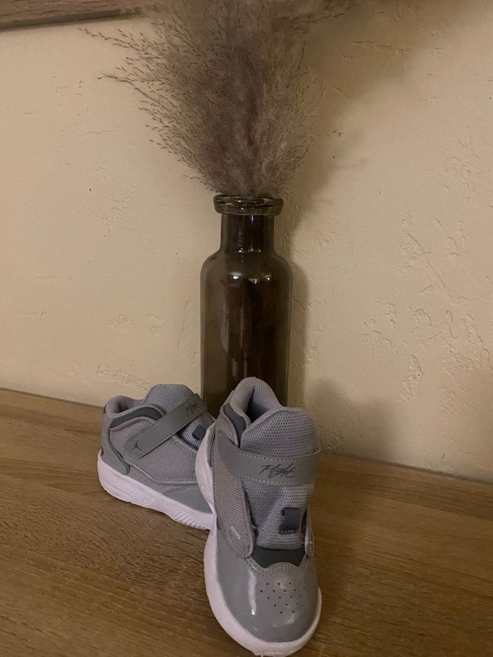 Vends paire de baskets Jordan originales, coloris gris. Portées une seule fois, elles sont en excellent état. Pointure 25, idéales pour enfant. Chaussures propres, confortables et faciles à assortir mais aussi à mettre.