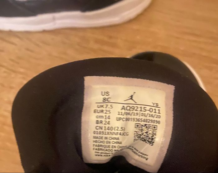 Paire de baskets Jordan noir et blanc – pointure 25 Vends paire de baskets Jordan originales, coloris noir et blanc, en très bon état. Portées seulement deux fois, sans usure visible. Pointure 25, idéales pour enfant. Chaussures propres, confortables