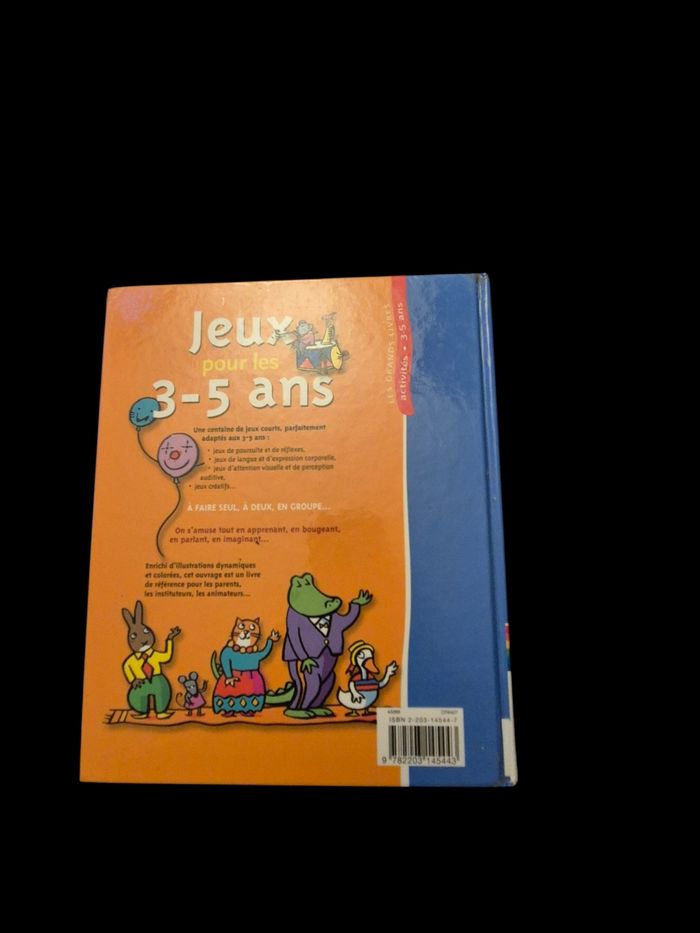 À vendre : Jeux pour les 3-5 ans de Clo Ady (auteure) & Annette Boisnard (illustratrice) Éditions Casterman – Collection Les grands livres (activités) ISBN : 9782203145443 Format album cartonné, 125 pages, illustrations adorables et dynamiques (chats mignons, lapins rigolos, couleurs vives – plein de petits animaux pour capter l'attention des tout-petits !) Un vrai trésor pour les parents, assistantes maternelles, animateurs ou profs de maternelle : une centaine de jeux courts et variés parfaitement adaptés aux 3-5 ans ! Jeux de poursuite et de réflexes Jeux de langue et d'expression corporelle Jeux d'attention visuelle et de perception auditive/tactile Jeux de motricité fine et créatifs Jeux en groupe ou en solo, avec peu ou pas de matériel Pour chaque jeu : matériel nécessaire, nombre de joueurs, lieu, variantes + intérêt pédagogique (compétences développées : coordination, langage, imagination, concentration...). On s'amuse tout en apprenant, en bougeant, en parlant, en imaginant ! Idéal pour les goûters d'anniversaire, les temps calmes, les crèches, les accueils de loisirs ou simplement à la maison quand on manque d'idées. Livre de référence, réalisé par des pros de l'animation petite enfance – coup de cœur pour les familles qui veulent des activités simples et enrichissantes !