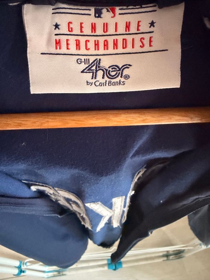 Veste New York Yankees – officielle MLB Marque : G-III Apparel Group / 4Her by Carl Banks Veste zippée bleu marine avec bandes sur les manches, logo brodé à l’avant et inscription au dos. ✔️ Marchandise officielle sous licence MLB Taille S