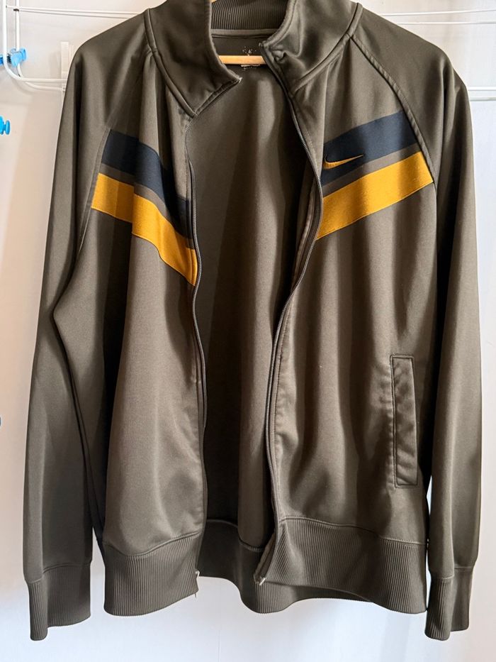 Veste track jacket vintage Superbe veste de survêtement Nike Sportswear au design rétro. Modèle avec motif à chevrons sur la poitrine, très élégant et original. Parfaite pour un look streetwear ou sport chic. Très bon état, fermeture éclair fonctionnelle, pas de taches ni de trous. Taille XL Couleur Iguana (kaki/olive)