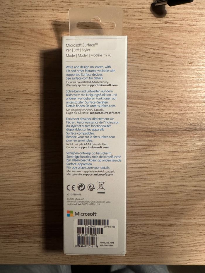 Je vends ce stylet Microsoft Surface Pen modèle 1776, neuf et jamais utilisé. - Type d'accessoire : Stylet - Marque : Microsoft - Modèle : Surface Pen 1776 - Couleur : Gris - État : Neuf Cet accessoire est en parfait état, jamais utilisé dans sa boîte d’origine.