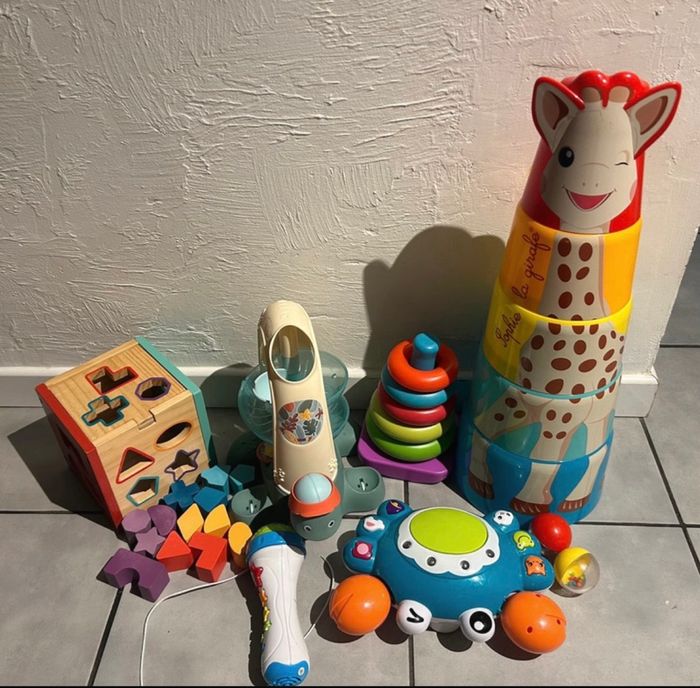Vend lot de jouet quelque trace d’usure mais ils sont en très bon état L’escargot est neuf Le cube il ne manque aucune forme