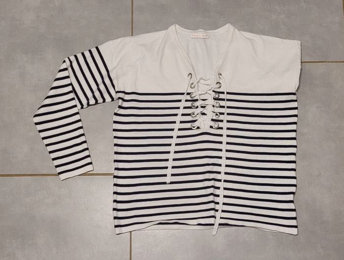 Très joli pull marinière, avec encolure V et cordage effet dentelle, blanc rayé noir, de la marque Peace n' Love, taille S, en très bon état. Article lavé pour la vente.