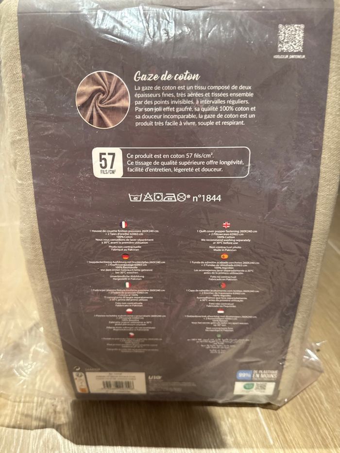 Parure de couette, housse de couette 260 par 240 cm et de tiges d’oreillers, 63 par 63 cm. 100 % coton, 57 fils, gaz de coton couleur sable. doux aérer léger respirant. Valeur neuf 60€. Le colis fait 3kg
