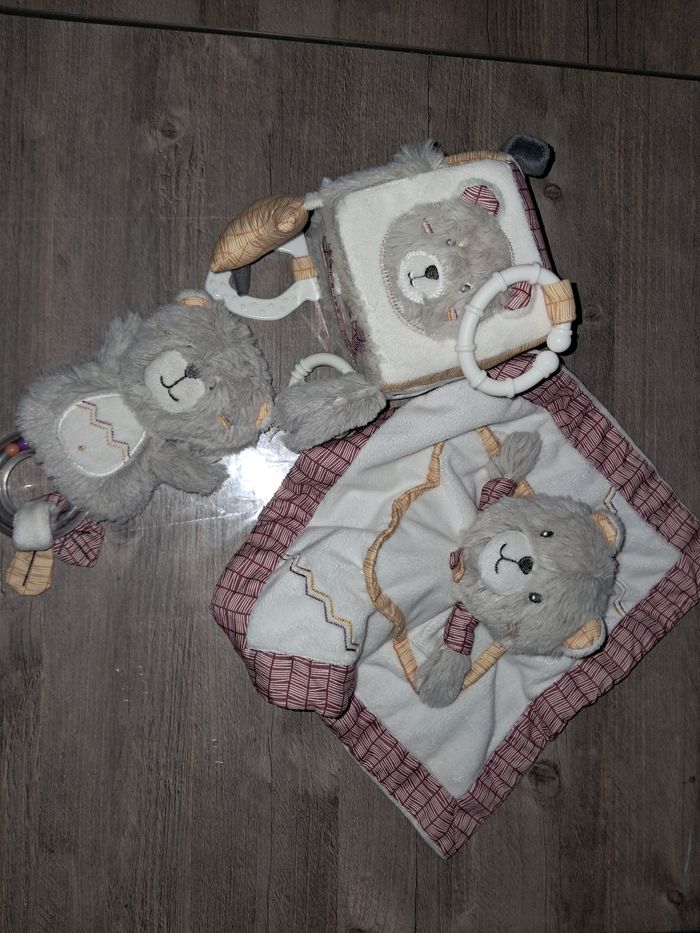 Vends lots de jouets d'éveil de la marque Sauthon, gamme Timouki le petit indien. Un petit cube d'activité, un hochet et un doudou carré. Jamais utilisés, très bon état.
