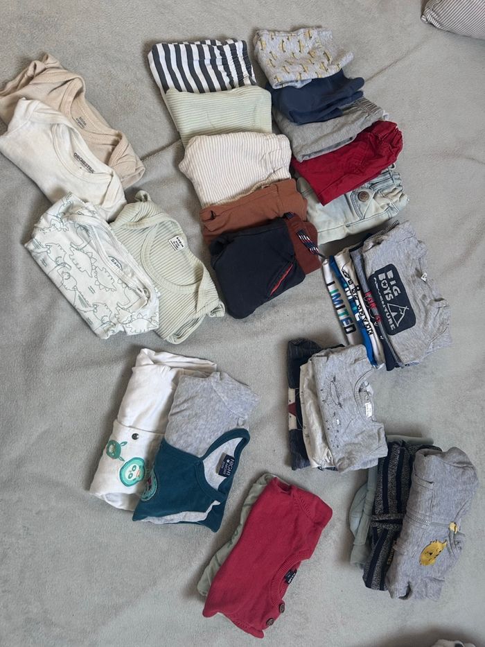 Bonjour! Je vends 2 lot complet taille 0-3 mois. Articles à -1€ je dois faire de la place donc doit partir à petit prix. J’ai fais 2 lots séparés ( possible d’acheter les 2 lots pour 30€ au lieu de 33€) ‼️ Deuxième lot : 18€‼️ 10 pantalon 11 petit pull 5 bodies 5 pull dont 3 a tirettes 2 pyjama Au total 33 articles⚠️